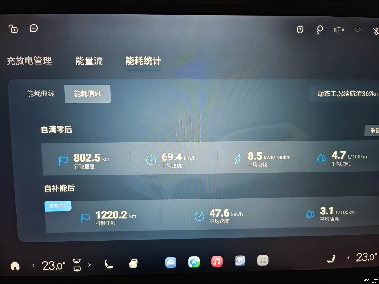 续航方面还是比较好的嗯,纯电续航能有200公里,当然这是在跑省道和国道的情况下,如果跑高速120也就是能跑130公里左右。在高速路上,如果采用满油满电油电混合的模式,应该能够跑到1100公里左右。图片上的油耗和电耗表现还是非常满意的,电耗基本上没有数据上差不多,油耗上,实际上我算了算,应该是5.05升每百公里。800公里大约有230公里左右,都是跑的省道或者是快速路一样的,这种道路其余的有600多公里,都是跑的高速,高速的速度一般都是按照110到115的速度来跑的。对这个能耗的表现,我还是非常满意的。