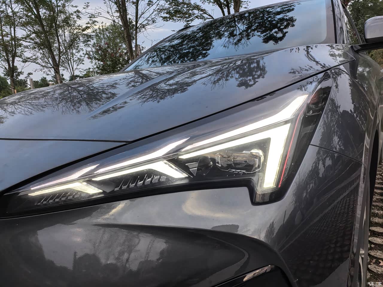 极狐T5的外观属于硬朗大气又精致耐看的类型。线条流畅有力,家族式的前脸尤其是那双狐狸眼大灯,炯炯有神,很有辨识度。车漆质感不错,在阳光下很有光泽。贯穿式的尾灯夜间点亮后效果很棒,提升了整车的档次感。
