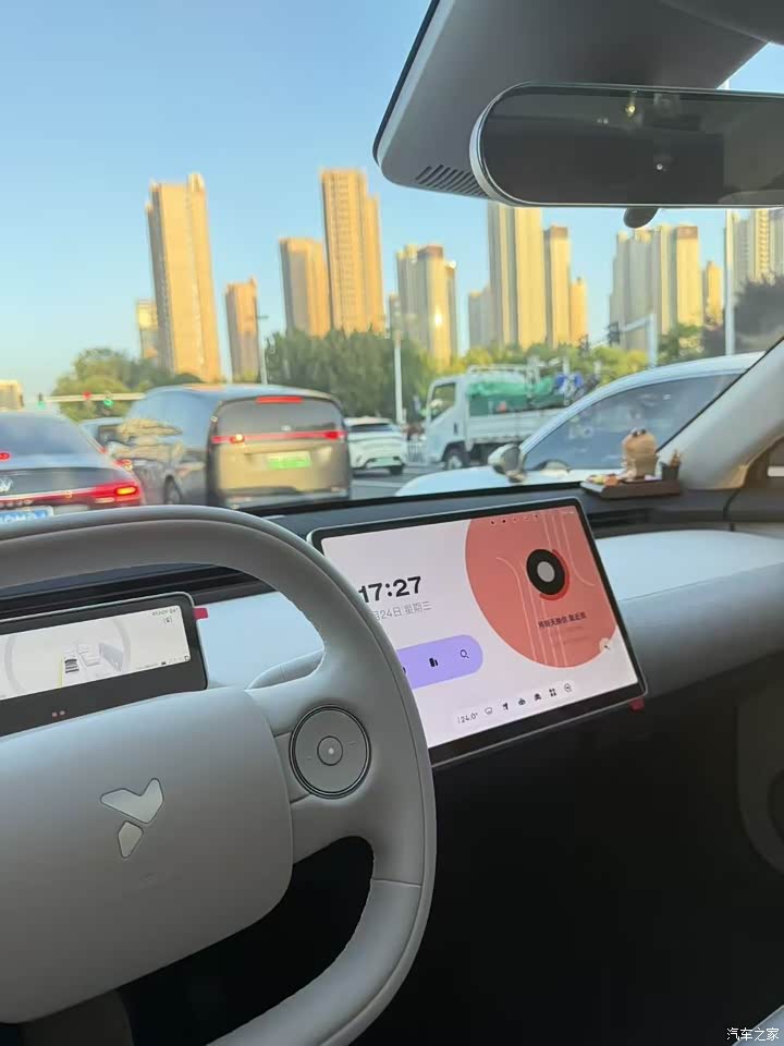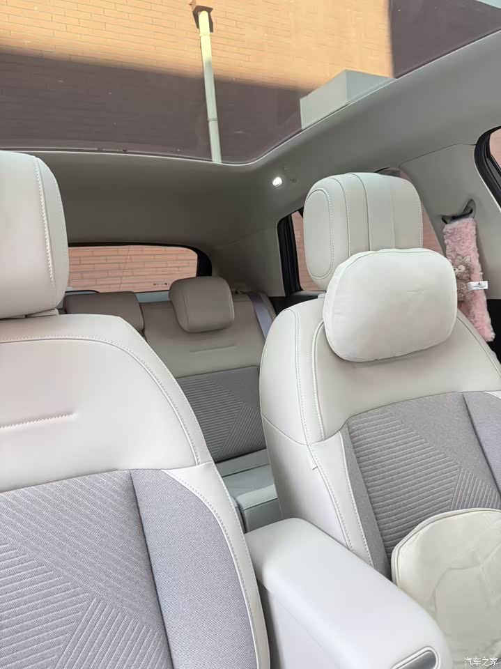 内饰也极其精致,虽说内饰极简,但是该精致的地方还是很精致的,就比如说这个中控屏幕,横屏的设计我个人感觉要比蔚来之前的竖屏看起来更舒服一些。屏幕的那几个可以滑动的圆圈实在是深得我心,每一个界面设计的都很高级,我还特意把可更换壁纸的圆圈设置成了labubu的图片,整个一个由内而外的labubu,一致带来的精致感,没谁了 到了晚上,氛围灯特别强烈。颜色也有很多种,小虫子的氛围灯,怎么说呢,前边那一圈映射出来有一点mini的感觉,然后门板上的氛围灯打下来像是一把小伞,又非常能给我安全感。 座椅方面的话要比想象当中更加舒服一些,而且还有座椅舒缓的功能,所以说长时间开车的情况下应该也不会特别累。对了主驾和副驾之间小虫子做的是贯通的一个设计,也就说说可以没有任何阻隔的从主驾驶位置挪到副驾驶位置,这个设计太独特了,也很方便主驾或副驾的人下车,比较友好