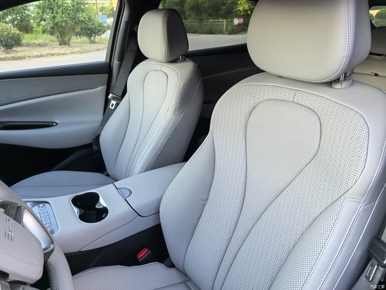 一坐进去,用料挺厚道,能摸到的地方基本都是软的,配色很清新,看着就凉快,不像黑色那么压抑。