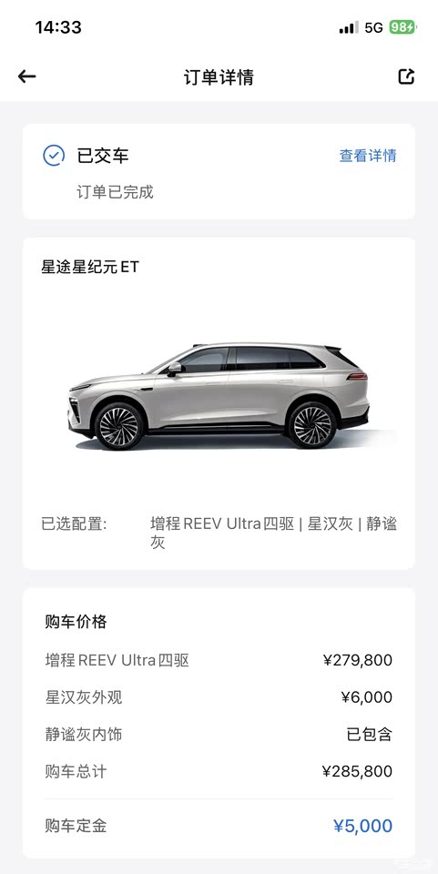 【购车经历】 因为有了小孩,所以想买一辆suv用作家用,因为对新能源车不了解,最初没考虑,去看了大众cc猎装,途观L,始终差一点点感觉,后来北京车展,然后就去逛了逛,发现新能源车从内饰、车机、外观都要比油车好上太多,而且同价位看新能源对比下来,简直是降维打击,了解过新能源的动力模式后,最终选择了三款增程,星纪元et,理想l6,阿维塔07,分别去试驾体验了一下,阿维塔的空间有点小,所以不考虑,理想的话,试驾的过程当中感觉噪音大一些,底盘有点软,最后et,当时是瑶光和et都试驾了一下,这两款车,就驾驶体验瑶光cdm最好,et更大一些,静音也很不错,当时试驾的是两驱增程版本,对于内饰,不是特别喜欢,但是他的机械素质很优秀,奇瑞额发动机热效率当时最高,所以跟媳妇商量后决定再等等看十月份的四驱增程,等到了十月底才陆陆续续有了四驱增程的消息,了解到内饰和外观都增加了新配色,并且两驱的一些槽点都弥补了,所以果断选择了盲订,等预售开启果断下定,接下来就是漫长的等车环节,等到十二月底才通知去提车,然后就开心的去提车喽!此时要感谢保定仲胖子,提车环节太好了,仪式感满满,管吃管住!必须赞! 【新车初体验】 车到手后,我是从内到外的仔细看了一遍,确实四驱增程跟之前两驱的内饰相比变化挺大,外观配色方面我定的星汉灰确实好看呀,内饰静谧灰更显清新一些,增加了遮阳帘,手套箱,音响也升级了,增加了高音头,星动吧台,内饰的配色也更加整体了,简直不要太爱! 【空间表现】 对于车的空间,将近五米车长的大五座车,后排可以跷二郎腿,特别宽敞,还有星动吧台中控打通,我觉得很方便,而且更宽敞,主副驾上下车更方便呀,不知道为啥有人吐槽这个,这不是设计上的革新嘛,干嘛那么千篇一律?我个人认为这个设计非常的贴心,后续不是有的车还模仿这个嘛! 后备箱的空间也是特别的大,特别能装,过年回家塞的满满的,装了不少,唯一的缺点就是后备箱的灯太小了,晚上特别暗,不好找东西! 【续航能耗】 目前已经开了一万五千多公里了,整体续航表现还是很满意的,天气暖和点纯电的续航基本200左右,冬天打折比较厉害,不过这是电车普遍的问题,我觉得没啥问题,用油的话油耗其实也还不错,毕竟这么大个suv,满载基本在2.8吨左右,百公里亏电油耗在八个左右,比油车好一点,基本上满油满电能跑1000公里左右,实测三四次,因为回一趟老家基本八百多公里,到之后还剩余200左右的续航,我个人还是很满意的 【辅助驾驶】 我订购的是有城市智驾版本,这个经过几个版本的迭代目前为止还是ok的,高速智驾非常满意,过年回家的时候全程基本很少接管,各种路况都可以轻松处理,城市智驾最开始就比较不好用,直行的路总是会向左变道后到路口又变回中间道,路况识别也不是很精准,遇到修路或者窄路就得接管,不过最近几个版本的升级在这一方面提升很大,以前上下班的路得经常接管,现在全程不用接管,最后说一句,辅助驾驶它毕竟是辅助人类的,不能够替人类,所以在开启智驾后还是得保持高专注度,手扶方向盘,安全驾驶!