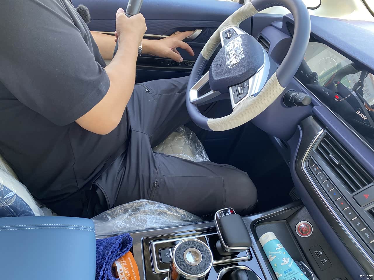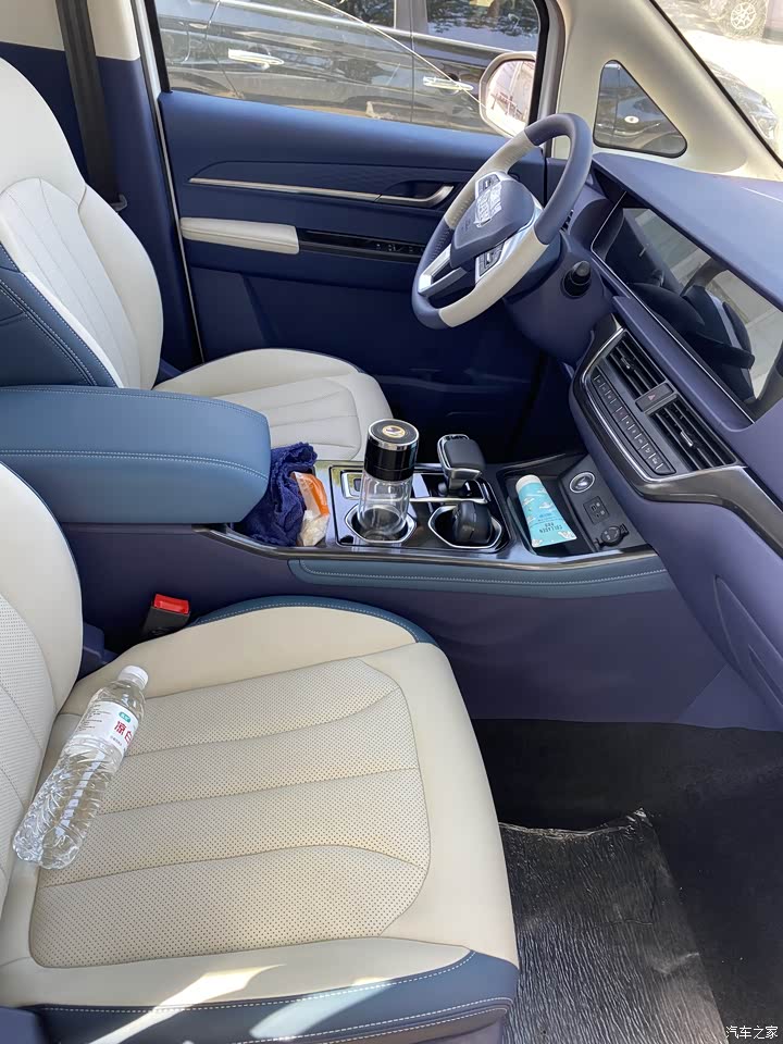 蓝白拼色的内饰看着就清新,环抱式座椅很舒适开时间长了也不咋累,车门上双层储物格放东西顺手看着还不凌乱。就是车内部分地方使用硬塑料材质,手感较差,看上去给人一种廉价感。