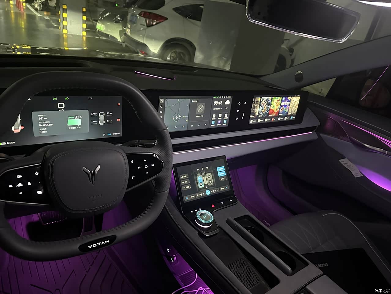 开起来方向盘有几个模式,我就用舒适的,手感轻,指哪打哪,刹车得适应一下,前面一段有点软,踩深了才有,能量回收我调到最低,这样松油门不会拖着走,坐车的人舒服,速度80以下就听见点轮胎声,再快点A柱那边有点风声,放点音乐也就不管了。