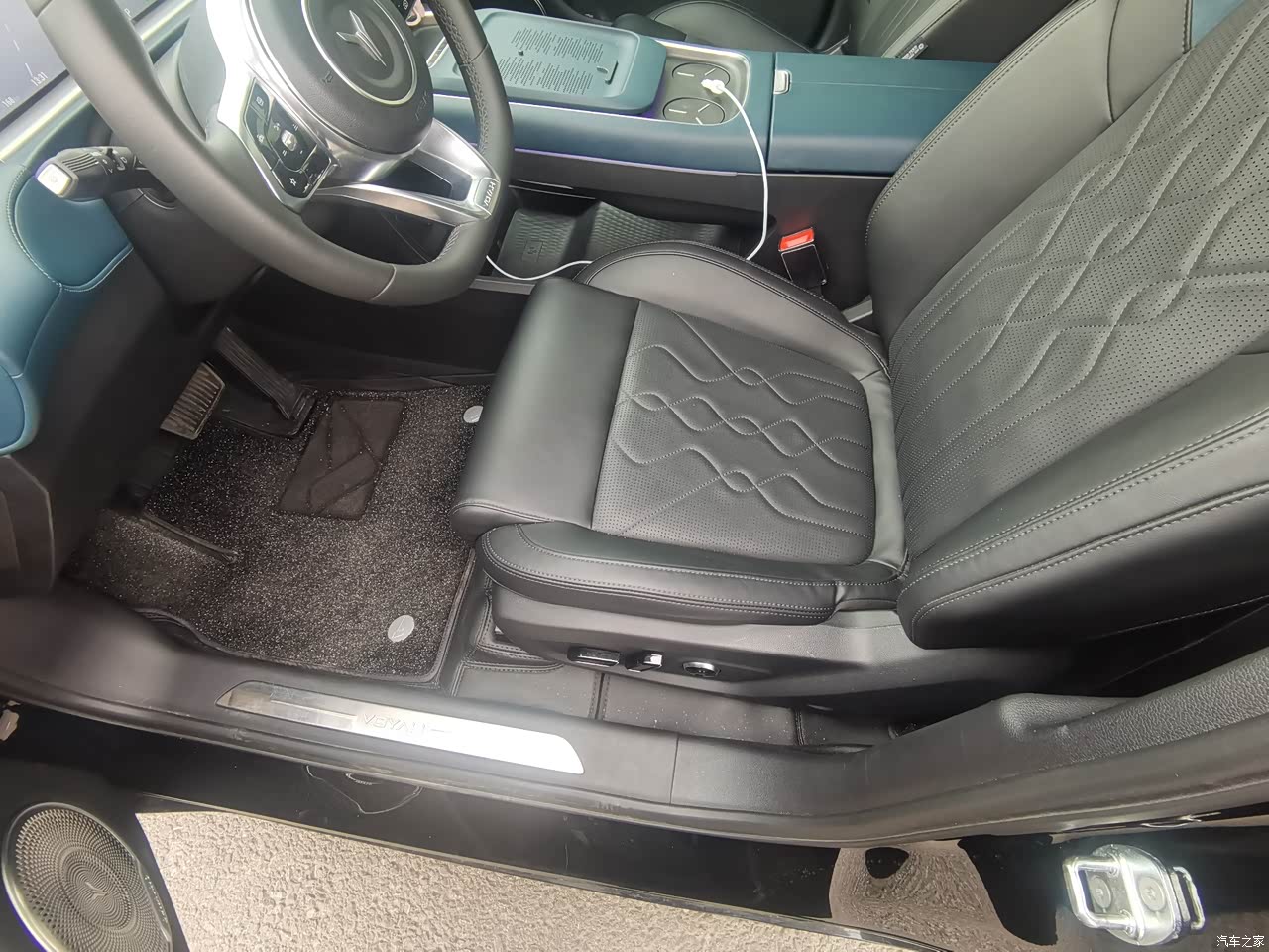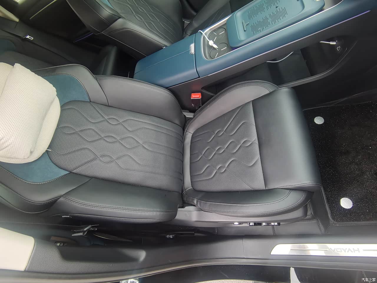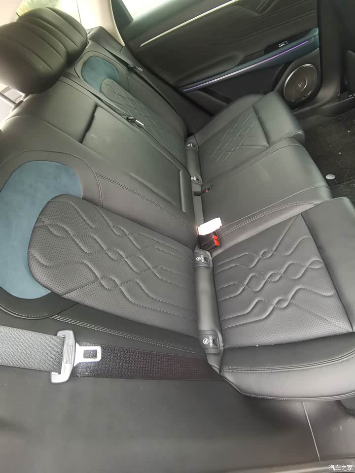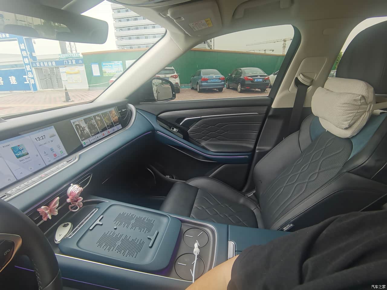 内饰弄的深蓝色,耐脏,夏天看着也不闷,坐进车里手能摸到的地方,大部分都是软的,中控台手感挺好,新车也没什么味道,那个一体式三联屏还能升降,车一启动,屏幕就自己慢慢升起来,还挺有仪式感,就是车机系统差点意思,新款把电子挡把取消了,中控台现在是两个无线充电板加杯架,看着是简洁了,但少了点开车的操作感,座椅倒是舒服,前排加热通风按摩全有,音响是丹拿的,下班路上听听歌,一天的疲劳能缓解不少。