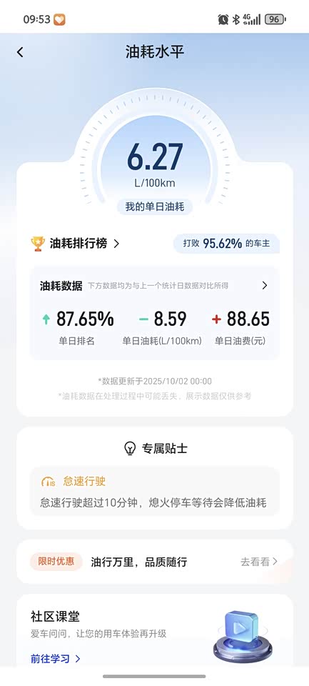 在油耗方面,一直听小红书上的帖子说美系车非常的喝油,尤其是搭配9 at的变速箱,基本上油耗会非常的高。但是在我每次200km回家的时候,我都会看一下安吉星上面的数据,如图上面所示,整个高速跑下来的话,基本上是6个油左右,有时候城市堵车也就才7个油左右,所以在油耗方面也感觉没有那么的吓人。