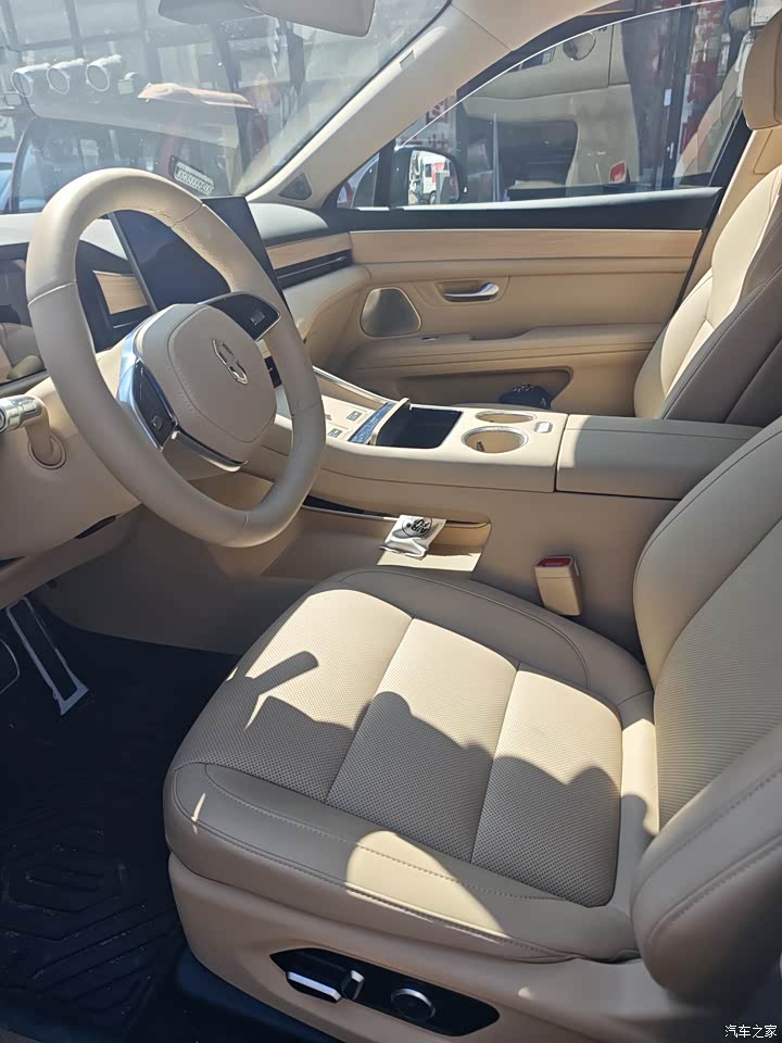 我选择的韶华杏,外黑内白的配色给人感觉十分舒适。内饰质感十足,显示屏一侧更是用木纹作为装饰,搭配上条状氛围灯,看起来很高级,老婆看过一眼就喜欢上了