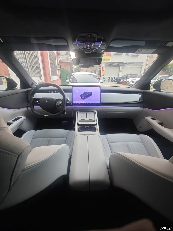 里头是灰白色的,选的时候心里也打鼓,怕不耐脏,其实勤快点收拾收拾也没那么麻烦,人坐进去感觉亮堂,不像黑色那么闷,朋友坐我车都说这内饰显好,看着干净,手能碰到的地方都是软的,那做工挺细,中间一个大屏幕,科技感是够了,座椅颜色浅,我专门买了套护理的东西,没事就擦擦。