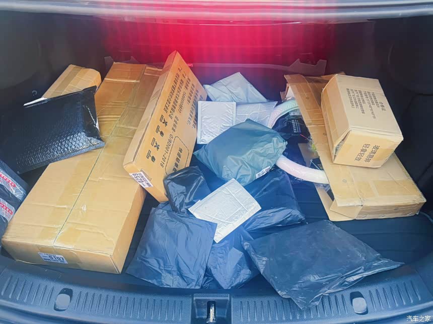 我特意买了配套的后备箱储物盒,分层设计超级实用。下面一层放充电线、抹布这些零碎物品,上面轻松塞进24寸行李箱、全套露营装备,再加上Amy的平衡车,居然还有空余!这个装载能力完全超出了我们对一台小车的预期。
