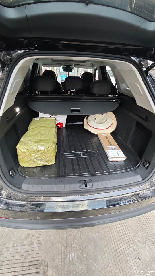坐在后排膝盖离前座还有将近两拳半,头顶也不觉得压抑,坐直了还有余量。 后备箱确实能装,两个24寸行李箱放进去,还能塞下折叠推车,剩下的空间正好放零食箱和我的钓具。平时超市采购更不用说了,婴儿车不用收直接就能横着放进去。