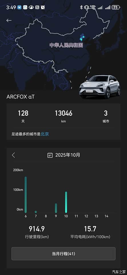 北京最近的天气,不开空调可以一比一,688公里完全没压力,开空调大概七八折吧,能接受,比磷酸铁锂电池强很多,也没太多焦虑,习惯了到20-30 之间,早上起来充电,然后出发。