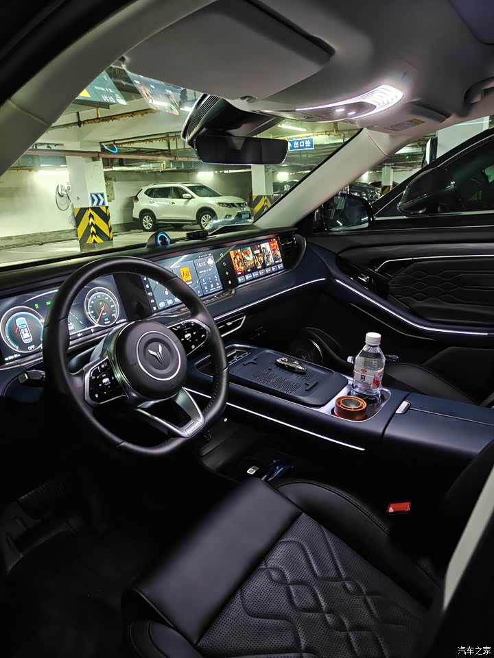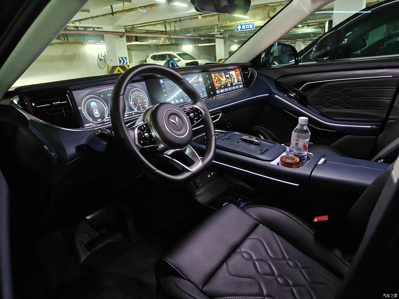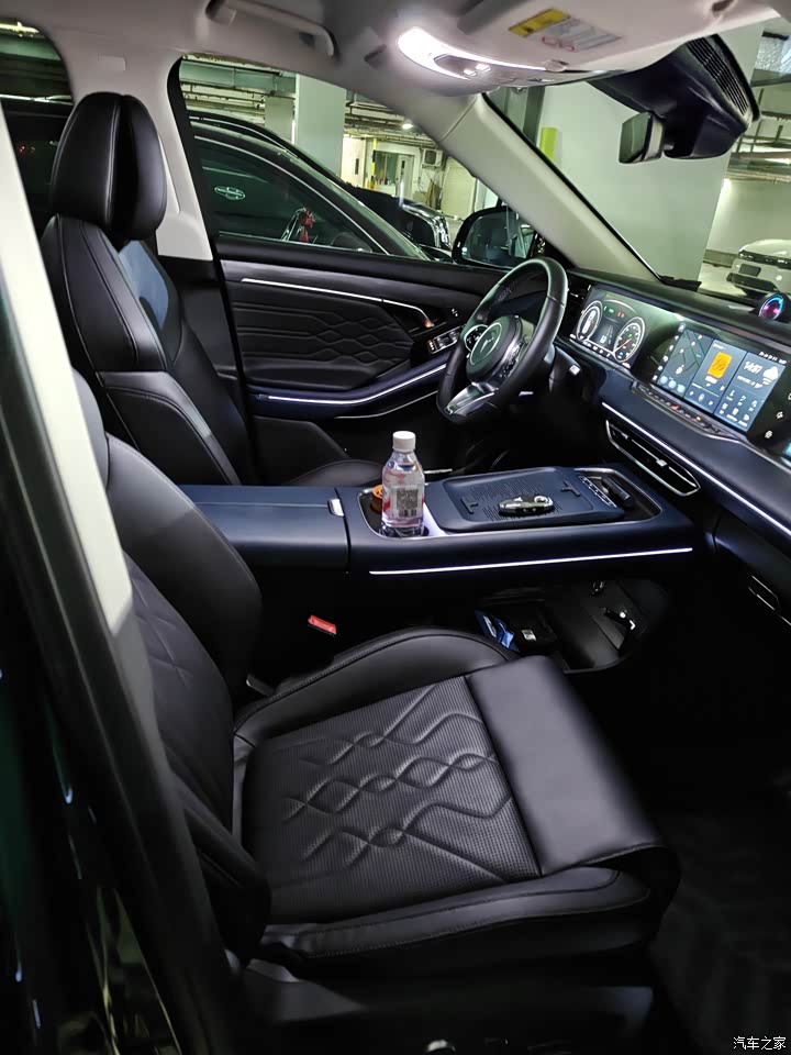 是蓝黑搭配,耐脏,看着也不沉闷,进到车里手能摸到的地方基本都是软的,中控和门板都是皮质包裹,手感不错,车里也几乎没什么异味,三联屏升起来的时候,仪式感挺到位,就是屏幕硬件挺好,软件拖了点后腿,新款换了怀挡,中控台面就空出来了,手机充电板、杯架用起来都挺顺手,座椅配置给得足,前排加热通风按摩全都有,下班路上开着按摩听听歌,丹拿音响效果也好,开车都不觉得累了。