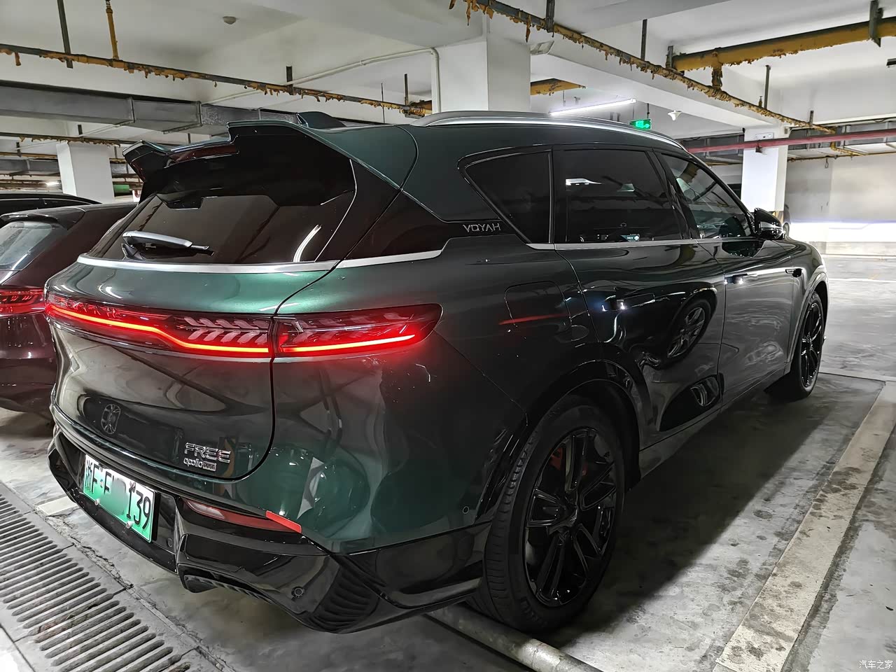 是黛绿色的,带着金属光泽,在太阳底下看,跟普通的黑白灰完全不是一个感觉,整车快5米长,配上黑化套件和低趴的姿态,运动味挺足,前脸的格栅做了熏黑处理,灯带一贯穿,有点机甲风,辨识度拉满了,侧面线条很流畅,20英寸的黑轮毂配上宽胎,车尾还有扰流板和箭羽尾灯,晚上亮起来,大老远就能认出来,停在什么地方都有人会多看几眼。