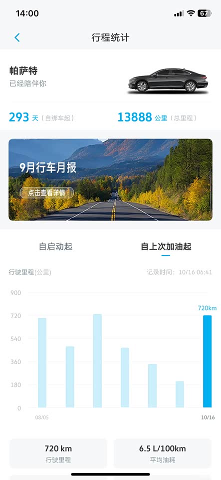 为了提供真实油耗,我用计算器计算出了13888km的平均油耗是8.59L/100km。其中单次最低油耗是行驶700km,平均5.7L/100km的油耗。最高油耗是行驶95km,平均12.5L/100km的油耗。通过数学计算我们可以得知,在帕萨特搭载2.0T的发动机的情况下百公里平均8.29L的油耗,我个人觉得非常不错了。 城市高架油耗,可以做到8-9油,高速油耗可以低至5.5。开空调也可以轻松做到5.9L。