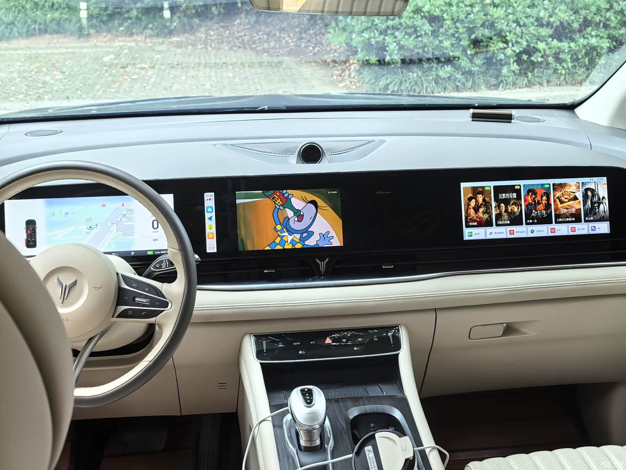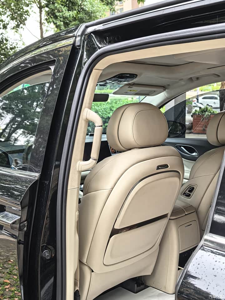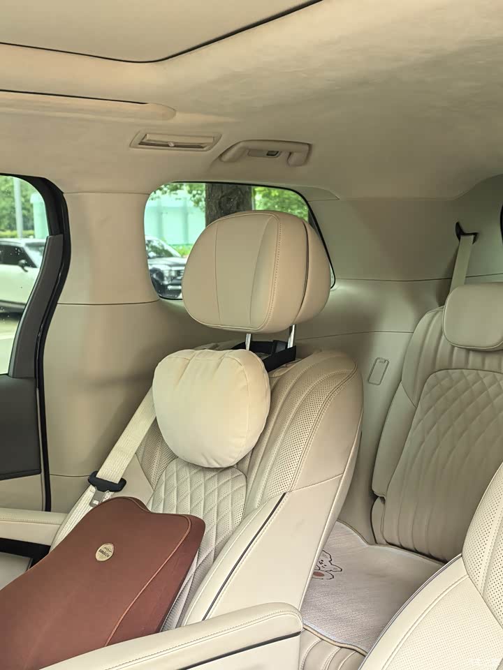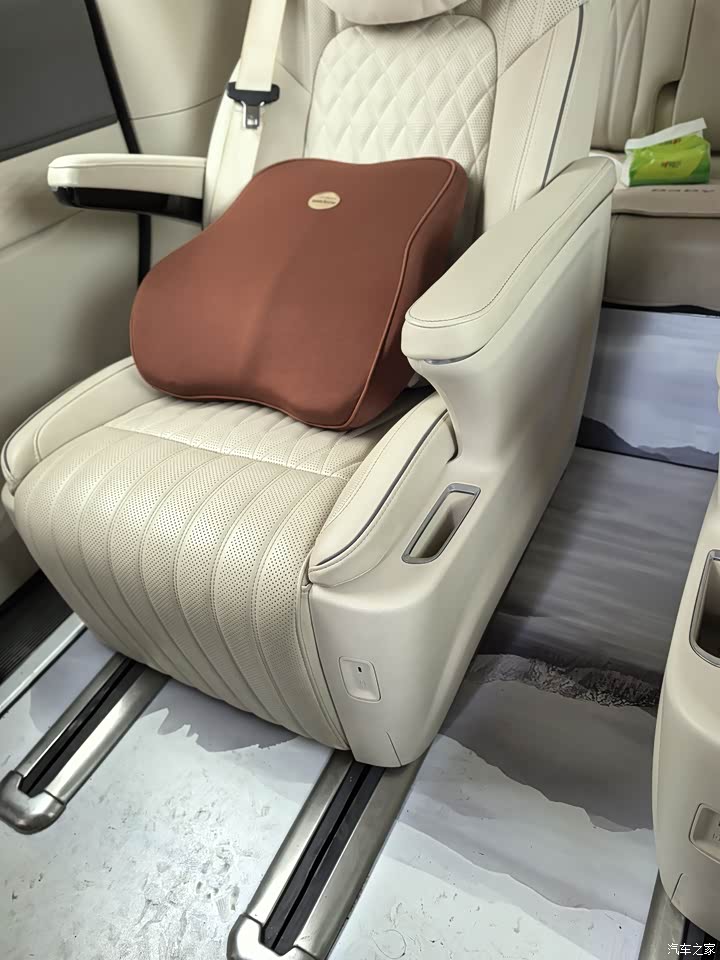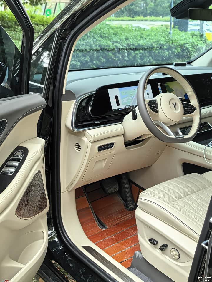 米色,坐进车里,软材质一堆,木纹点缀,环抱式座舱,前排三联屏,科技感,座椅皮质,坐着舒服,主副和第二排都电动调节,前排加热、通风、记忆、按摩都齐全,第二排座椅扶手有触摸屏,腿托大角度调,按摩也有,老婆孩子都喜欢第二排,出门路上直接开按摩,舒服睡一觉,后排17.3寸折叠屏,方便娱乐,前排扶手箱后面冰箱,夏天冷饮随时有,64色氛围灯,晚上开起来氛围感拉满,不过米色容易脏,要勤打理,稍微一沾灰,挺明显。