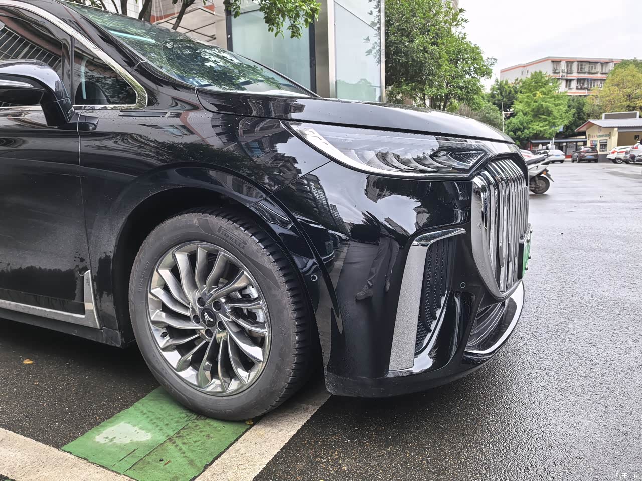 黑色,玄英黑,4S店里看过,曜日紫、玄英黑、日耀金、杜若白,最后还是觉得黑色最有气场,车长五米三,宽将近两米,修长稳重,鲲鹏展翼前脸,格栅大,直瀑式镀铬,贯穿日行灯,中间LOGO会亮,晚上解锁,大灯流水效果,仪式感足,侧面二十寸轮毂,腰线很有力量,尾部方方正正,空间顾得上,L型尾灯熏黑,辨识度高,每次停好车都得回头瞅两眼。