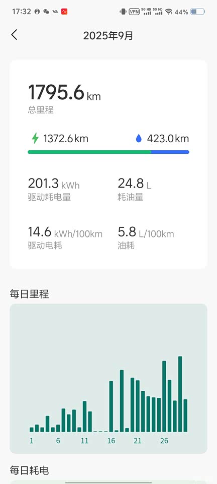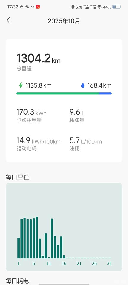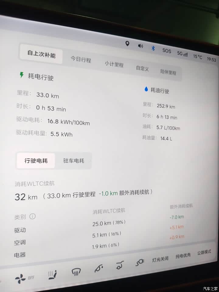 我通勤的话往返60km,其中20km高速,剩下是城区道路,用电的话基本上2天一快充。夏天的时候和现在降温后区别不大.有时能超出表显,最高时到200km纯电续航。跑远处就油电混,油耗基本在6以内。