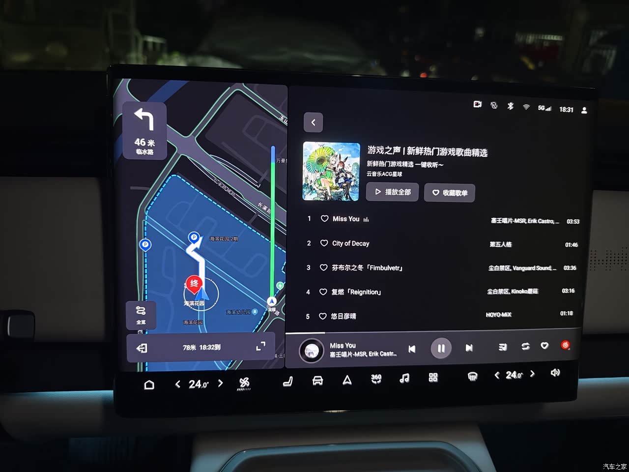 智能化这块吧, 24款肯定不算最顶尖那一批, 但跟油车比那进步太大了, 车机用着挺顺溜, 就是软件商店里的APP不多, 那个语音助手, 简单的指令都能听懂, 复杂点的就得一句一句跟它说, 高速NOA辅助这个功能, 在高速上开确实能省不少力气, 自动变道, 自己上下匝道都没问题, 就是车一多它就变得很小心, 有时候还得自己上手, 车道保持大部分时候挺稳, 偶尔也会偏一下, 所以手还是得随时扶着方向盘, 那个自动泊车对新手挺好的, 识别车位的成功率很高, 基础功能都有, 跟最新的那些比起来差了点意思。