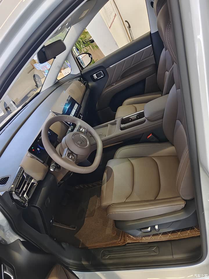 它的内饰上看起来也是比较高大上的那种深棕色,还有浅棕色的两种内饰,全车都是皮质的一个包裹,座椅所看到的地方都有皮质座椅,摸起来比较舒服,比较有高级感,中间配了一个大屏显示,还可以,感觉比较好看!