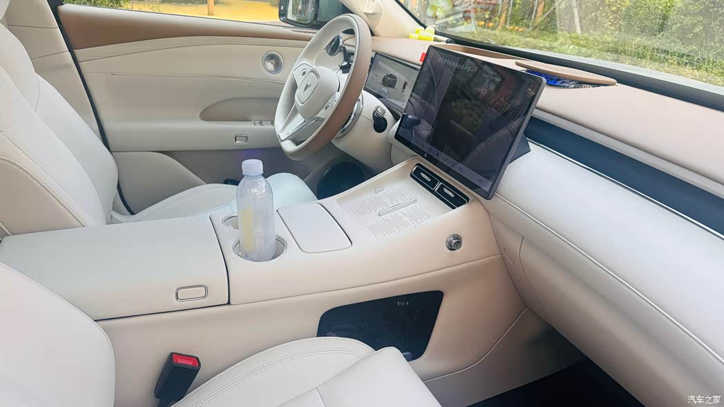 内饰这块,岚图FREE四驱版还真没让我失望,中控台上大面积都是软质材料包覆着,摸起来手感挺细腻的,比之前开过的路虎揽胜运动版那硬塑料的部分少多了,缝线工艺也挺讲究的,看着就很有档次感,中控屏很有科技感。