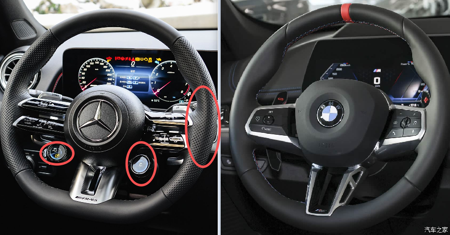 X1 M的方向盘素,功能弱。GLB35就有打孔,集成驾驶模式切换,自动启停开关,AMG方向盘大爱。