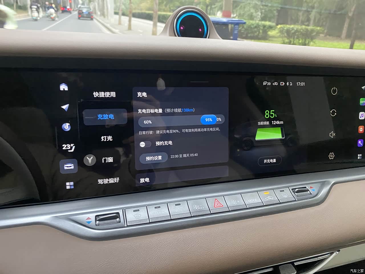 充电特别方便,晚上利用谷电价充电,一度电才3毛8,充满一次电花费很少,比加油省太多啦。日常通勤每天往返30km,一周充一次电完全够用。高速服务区的快充也很方便,上次跑长途,在服务区吃个饭的功夫,电就充得接近80了。支持预约充电和充电进度查询,比如设置晚10点后开始充电,早上起来就能满电出发。