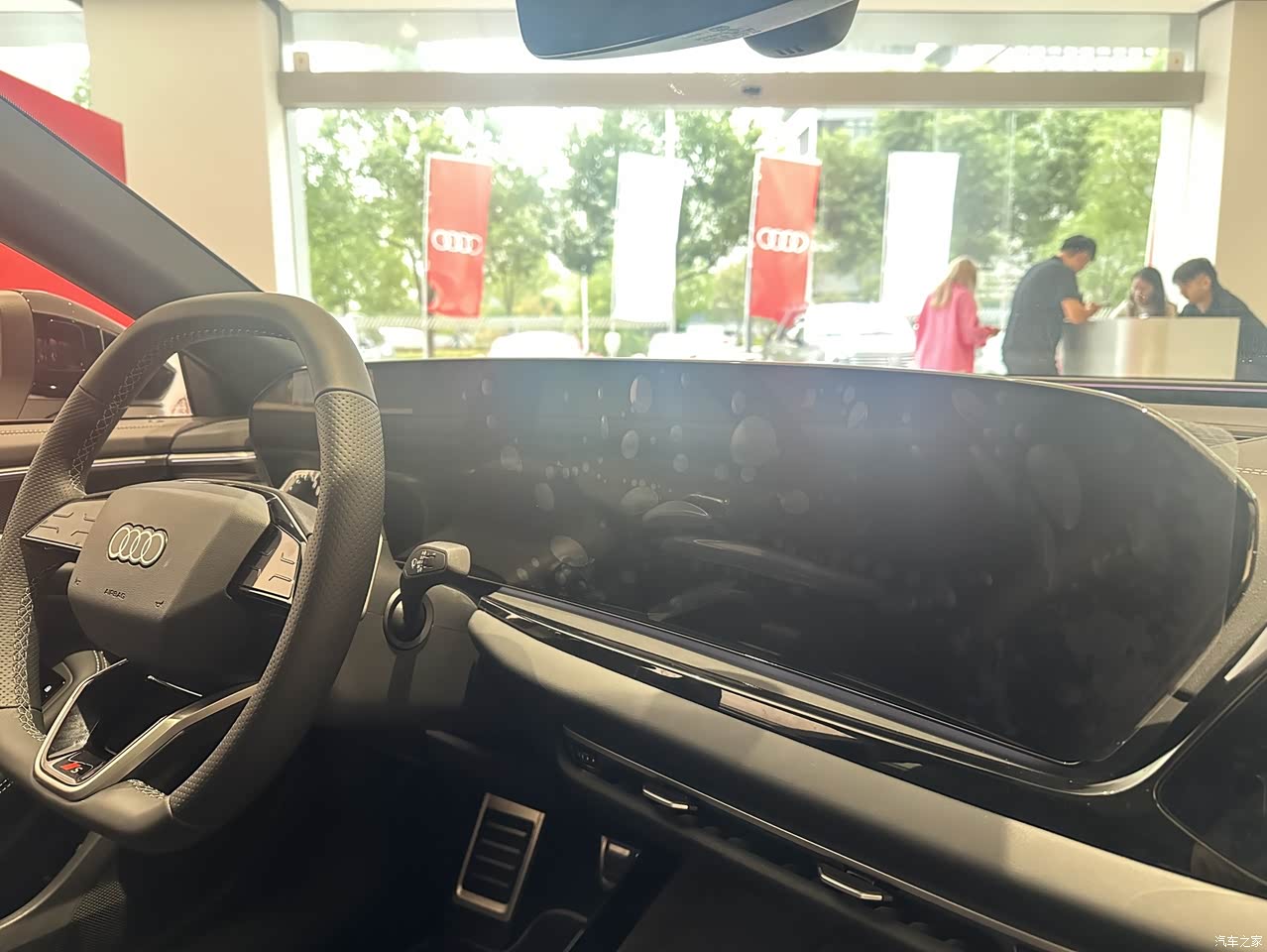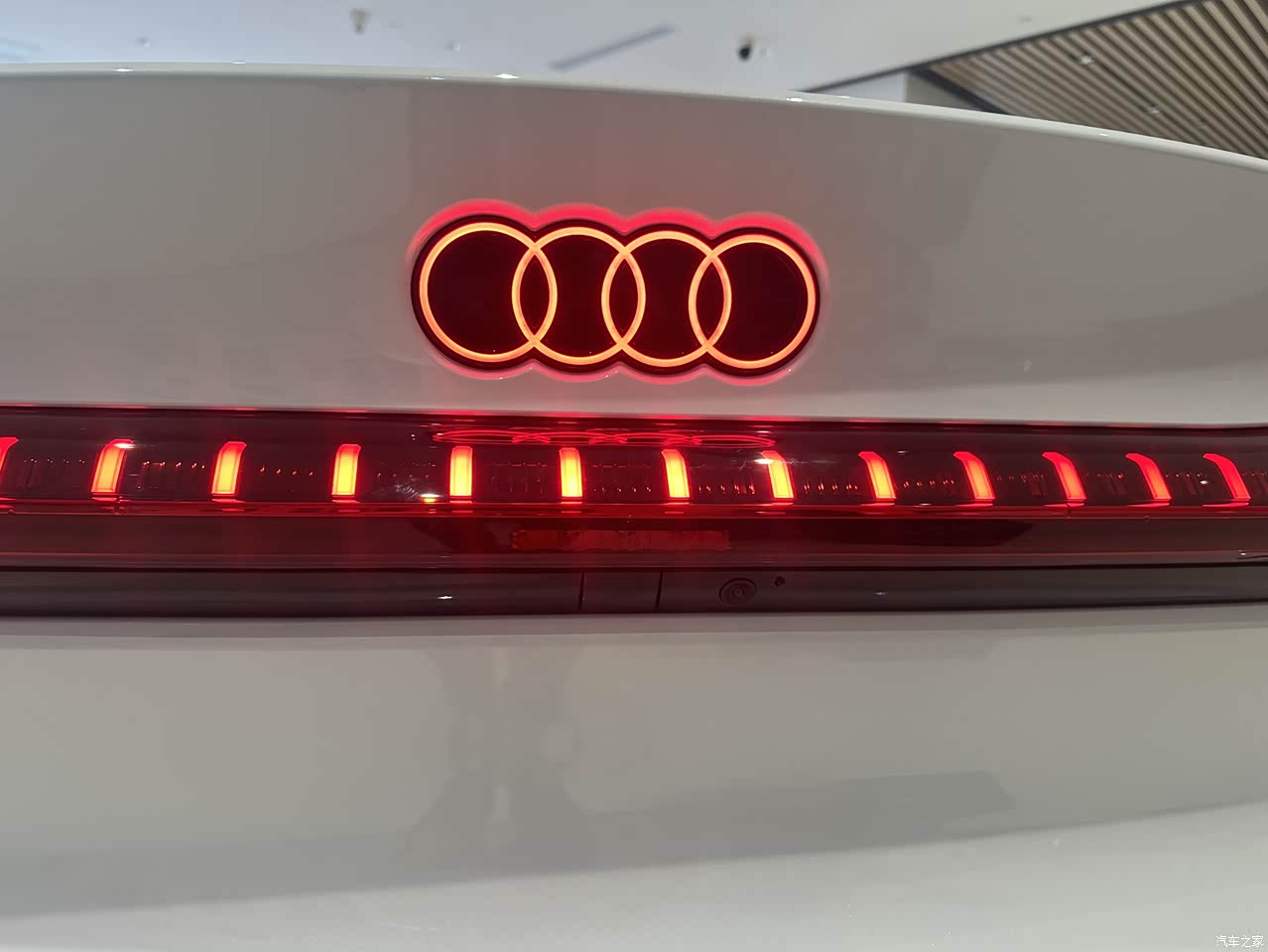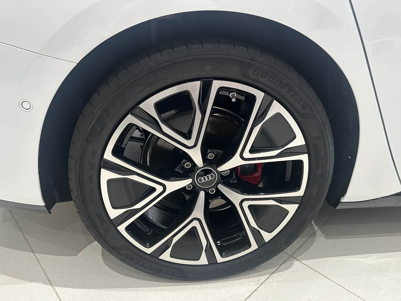 实车看着就特霸气犀利,完全是奥迪家族的运动调调,整个车身低趴有力的,车身线条流畅、潇洒、大气。尤其是试驾车黑化的大轮毂,再加上红色卡钳,视角效果爆炸,运动感直线飙升。
