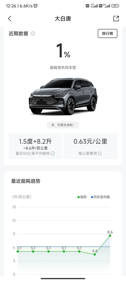 作为当时中型插混SUV性价比确实可以,只是维持了短短半个月新款DM5.0就出来了,老车主的通病都有背疼的毛病吧。 经过1年深度使用,这款车的综合表现还是很满意的。 霸气龙颜前脸比唐L(元por max)好看,顺眼,也是因人而异吧。贯穿式LED尾灯初见时耳目一新,目前烂大街存在也没有什么感觉了。银釉白车身在阳光下呈现一点淡蓝色不知道是什么技术,加油站拍的就和提车时的不是一辆车似得。感觉还是没有灰色的耐脏,前一辆就是白色的,无奈老婆大人要白色的,只能遵旨。20英寸轮毂大脚很稳,刚开始开电车时,起步点猛的时候前轮出现多次打滑,电车治好了我起步轰油门的顽疾,安全上又提升了一大步,真好! 空间上2.8m的轴距后排乘用空间很舒适。第三排小孩“马札”适合160cm以下使用,应急时候偶尔用一下,平时都是当大五座使用,长途行驶第三排真心难受,后备箱第三排不放倒基本就两个行李箱就差不多了,放倒第三排是真能装,平时露营用的天幕、桌椅啥的轻轻松松毫无压力。座椅真心不耐脏,尤其是主副驾上车那边,不知道有朋友知道用什么东西可以擦干净。车机大屏旋转功能基本用不到,竖起来遮挡视线,自带的导航没有车道级,自己下手机版的话不能投屏到仪表盘,真是鱼和熊掌不可兼得,那就干脆上支架,出远门时候使用下。还有就是钢琴烤漆就不多说了大家都懂。哦对了,车机系统启动还是挺快的,基础操作都是非常流畅。语音指令有点不能执行有点不方便,驾驶中要在设置里面找的话不安全。对于耳聪目明的人来说,语音提示要是能在调小点就好了。 油耗方面,亏电油耗7L/100km左右,纯电17度/100km,当然跟驾驶习惯,路况、速度关系很大。满油满电综合续航表显1000km出头,节假日高速堵车和市区上下班通勤时优势明显。但冬季电池掉电很快,家里和公司有地库的话还能好很多。开了1万km综合下来也就不到0.3元/km,用油大概开1/3,家里有充电桩。家充充电功率基本就是6kw,距离远的家充还是加点钱上粗点的线缆,线缆一定要注意用大厂的。 要说最满意的就是提速快,高速并线,超车会很丝滑,坡道提速无压力。1.5T发动机嘶吼起来噪音也不小,首保后略有降低。整车噪音处理还是不错的,前排是夹胶玻璃。定速巡航车道保持挺好用降低驾驶疲劳明显。 最后给几点用车和驾驶的技巧: 1.新车最好把胎压降下来,我提车时的胎压290了,抓地明显下降,遇到紧急情况刹不住,等新车适应后可以根据自身用车习惯和路况调整。 2.高速长途驾驶使用LCC建议打开偏离抑制,这样不打转向灯就会抑制方向盘转向,提高了变道安全性,还是不要疲劳驾驶,安全第一。 3.上山后不需要充电的话就别充了,充满电下山就浪费了动能回收这么强大模块了。要不我领先99%的同车型怎么来的。 不对之处请各位指正,有好的建议也请不吝分享一二。