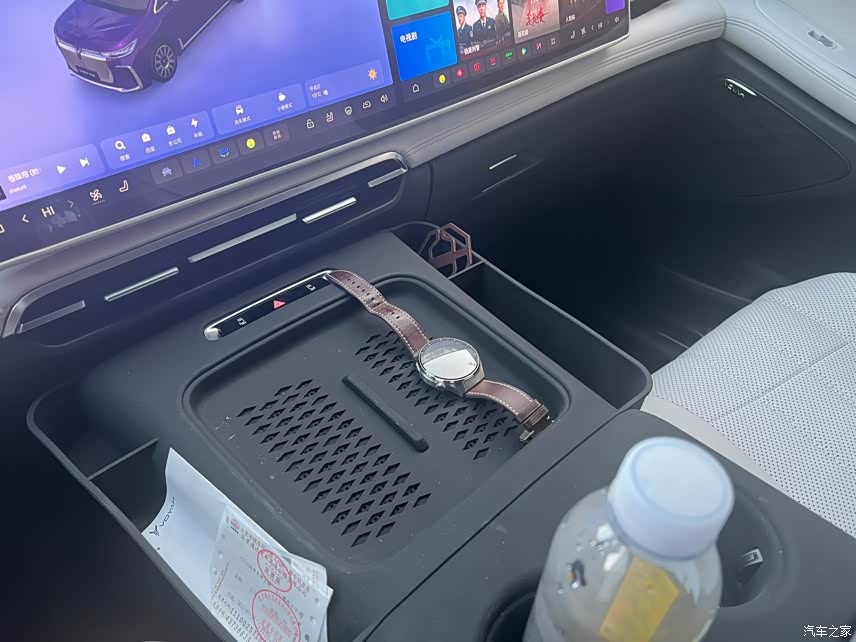 中间扶手箱挺大的,不过里面没有进行分区,所以把水瓶和纸巾放进去之后,其他的一些小物件就只能随意地堆放在一起,想要从中找到东西可真是费一番周折。而且最让人感到困惑的是,居然连车顶墨镜盒都没有设置,平常像墨镜、高速卡这类的小零碎只好随手放在杯架里,这样不仅占用了空间,还显得特别不整洁。