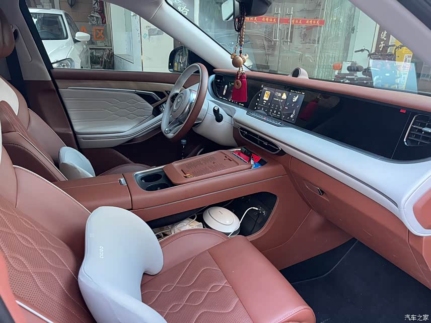 内饰的风格则是新能源设计的风格,中控屏是采用的一块三联屏的设计,也是支持了一键的升降。副驾驶也可以,使用娱乐屏进行观影等活动。屏幕的尺寸偏小了一些。车内比较好的一点是实体按键比较丰富,包括车窗,后视镜的调节,以及驾驶模式的选择,自动泊车,360影像等,都可以用实体按键进行控制,非常适合从燃油车过渡到新能源车的车主。车子的内饰质感很不错,皮质包裹很多,塑料感很少。整体上来说还是比较豪华的。