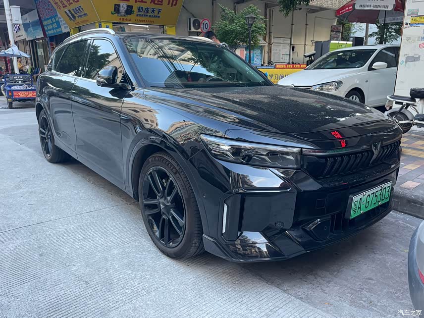 外观十分帅气,当时在选车的时候,第一眼就被这台车所吸引。十分像美式肌肉车的造型,棱角比较清晰,尤其是前脸的保险杠十分的帅气。再搭配酷酷的大灯,发光式的灯带以及发光车标,整车又有科技感也有力量感。黑色的颜色使车子看起来是一种黑武士的风格,不再需要去进行改色。原车的黑色很帅气。侧面轮毂熏黑配置十分的运动。尾部很协调,也是传统SUV造型的尾部设计。就是后面的车标没办法发光,辨识度差了一些。