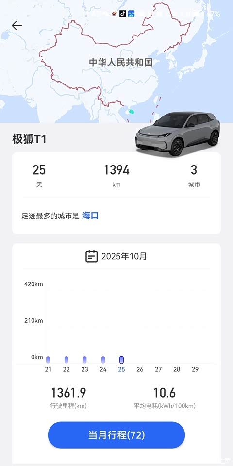 作为每天往返70公里的通勤党,选电车就怕续航虚标,直到开上极狐T1 425plus,才算彻底告别续航焦虑!最近通勤实测,数据真的惊到我~ 我的通勤路线超有参考性:每天来回小记10公里市区路段+10公里高速连接线+50公里纯高速,高速占比70%!全程没开定速巡航,全靠温柔脚法把控,高速最高跑到120km/h,因为海南这段时间天气的原因,空调一直固定25℃开1档,不冷不热刚好舒服~ 四天跑了近280公里,今天下班看仪表盘还剩74公里动态续航,相当于实际跑了350公里左右,达成率真的没话说!最惊喜的是,有一次通勤电耗直接低到9.6kwh/100km,平时稳定在12kwh/100km左右,这个表现太能打了~ 分享个省电小秘诀:脚法轻一点,避免急加速急刹车,空调25℃+1档完全够用,不用盲目开低温高风速~ 我把这周的通勤情况截图出来展示下,真实数据无水分,极狐T1的续航实力,通勤党闭眼冲不亏!