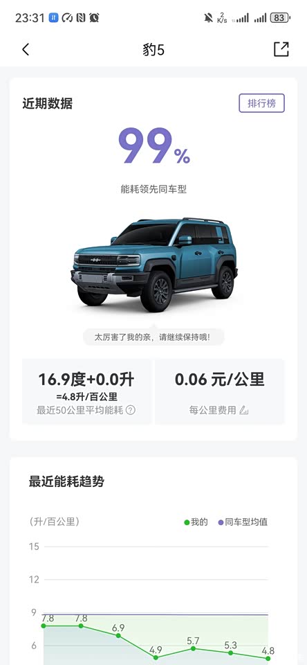 钛7已经上市一个多月了,销量不错,不过对比下来,我觉得豹5更适合我。100公里左右纯电续航通勤够用,外观更硬派,有大梁真越野,内饰用料做工也更精细。相比便宜大碗的钛7,也许豹5更适合诗和远方。 最满意: 豹5的1.5T插混系统+双电机,综合功率505kW,零百加速4.8秒,动力输出迅猛,城市超车、高速并线游刃有余。纯电续航125km(CLTC)基本满足日常通勤,实测城市工况达成率超90%,谷电每公里成本不足0.1元,大幅降低出行开支。新款车型进一步优化电池管理,WLTC综合续航提升至1200km,长途穿越无需频繁补能。 最不满意: 低速刹车脚感偏软,需要多放一些提前量,不过开多了适应了也还好。后备箱侧开门便利性不佳,拿取行李不如掀背尾门方便。 初代车型没能实装璇玑架构,导致目前辅助驾驶仅有高快辅助,新款的天神之眼与乾坤智驾版本着实让老车主十分的羡慕。 外观: 豹5线条硬朗,车身高大,外挂备胎,辨识度很高,硬核气质满满, 内饰: 内饰质感不错,软性材料用的比较多,虽然是硬派越野,舒适型还是要有的,豹5跟大G一样,内饰平衡感不错感,既有气势,也不像日系那样塑料感满满。副驾娱乐屏和独立蓝牙是老婆追剧的最爱。 操控: 既然是硬派越野,通过性强是必须的,过沟过坎都没问题。日常公路驾驶,双叉臂悬架滤震优秀,铺装路面行驶质感接近城市SUV,悬挂整体偏硬但过弯支撑不错。 能耗: 亏电状态下高速均速100左右,油耗约8-9L/100km,激进驾驶可达11-12L,优于传统燃油越野车。83L大油箱,用70%保电设置,续航轻松超过1000公里。听说冬天纯电续航会打折,但愿能有70以上。 我亲身测试黄金右脚的舒适四驱模式下,最低电耗控制在17+kw每百公里,折算油耗近似为有4.8L。 性价比: 刚提车就上了续航更长的新款,纯电续航200,但价格高了2万,果然还是一分钱一分货。不过省下2万块,也够小两年用车费用了。