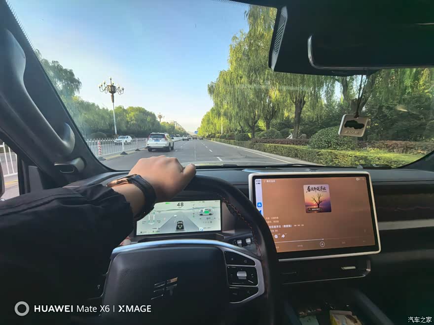 乘坐够宽敞,车机有小遗憾,空间表现挺符合家用需求的。我 175cm、150 斤,调整好驾驶座后,头部还有一拳两指距离,腿部也很充裕。媳妇儿坐后排,腿部能有两拳多空隙,中间地板几乎纯平,老人坐中间不用蜷腿。座椅是皮质包裹的,支撑性不错,就是靠背角度有点直,跑长途超过 3 小时会觉得腰累。 储物设计很贴心,四个车门能放大瓶矿泉水,主驾门板还能塞折叠伞,中控下方的 50W 无线充电板速度也挺快。车机搭载了高通 8155 芯片,日常操作不怎么卡顿,但开机得等两分钟,地下车库没信号时导航还得靠手机,而且不能下载第三方 APP,有点局限。娱乐方面主要靠连 CarPlay 听歌,音质不算惊艳但够用。