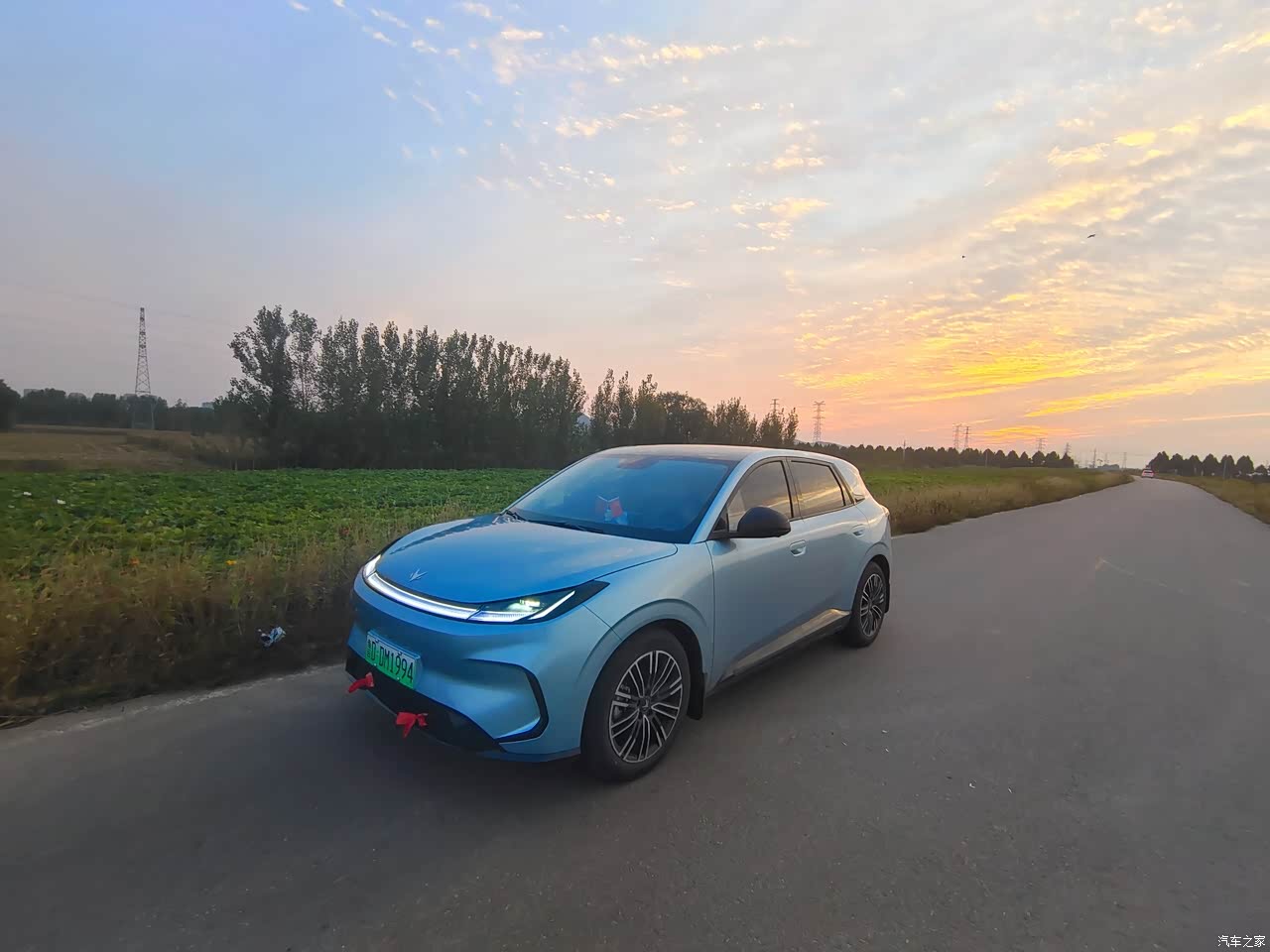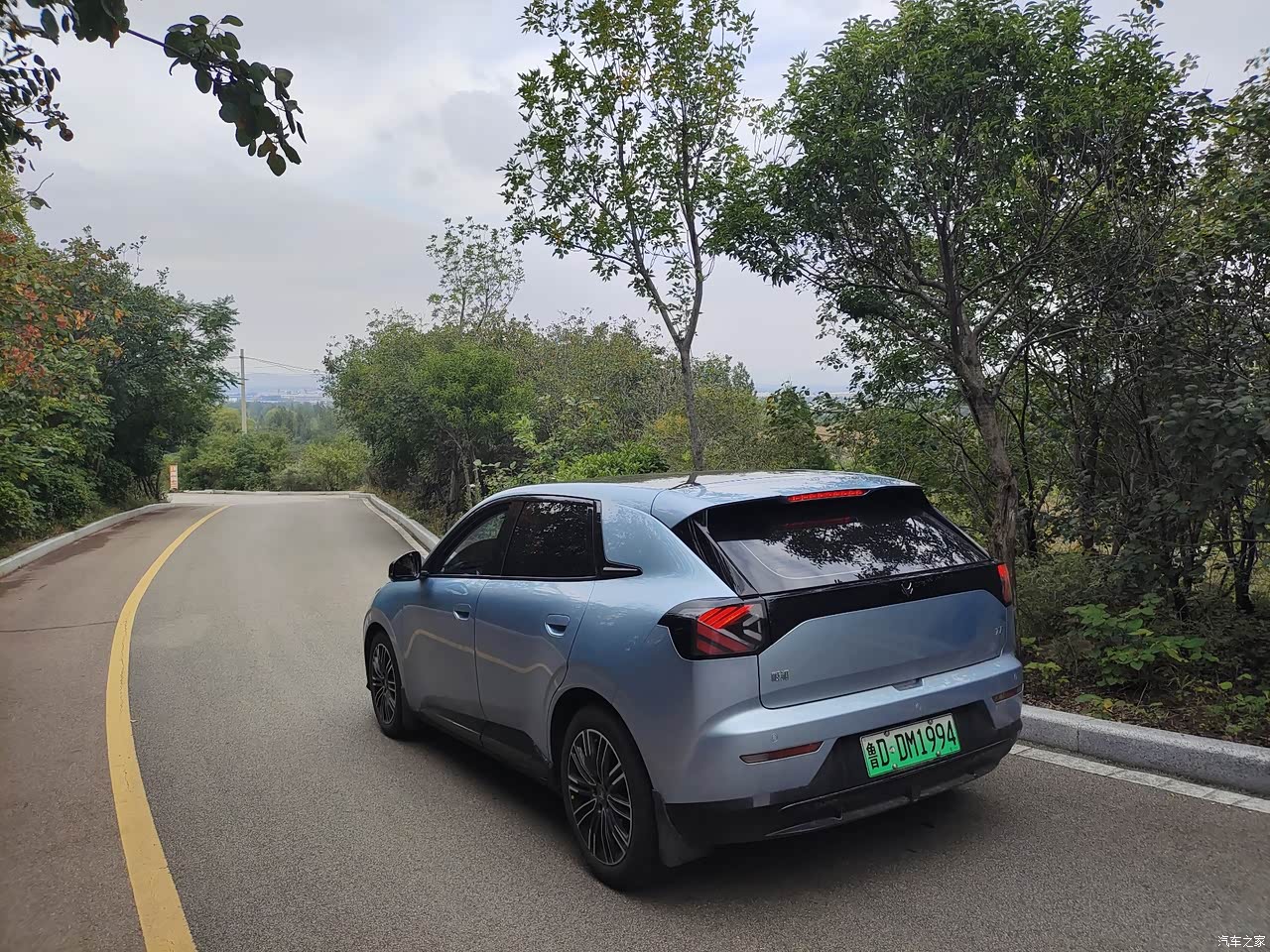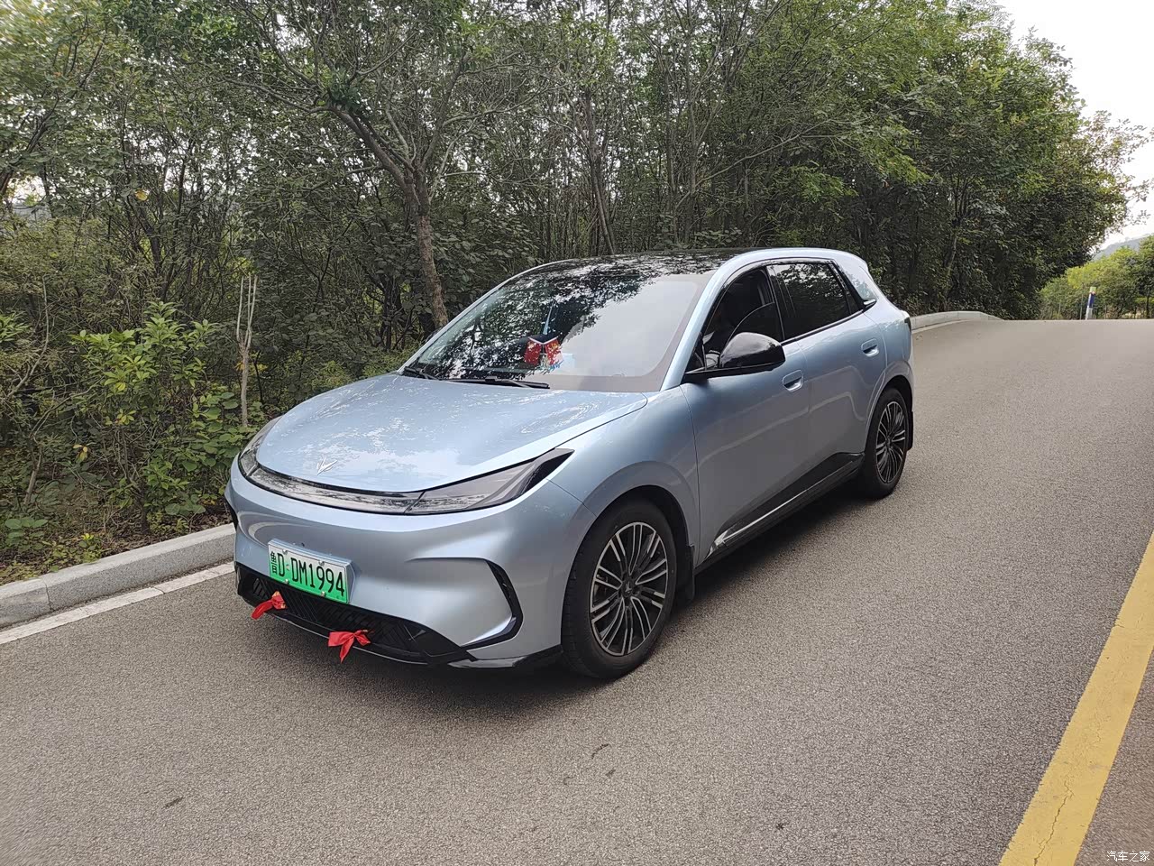 因为国补问题,没有选择到自己喜欢的紫色的那款,虽然有点遗憾,但是瓦纳蓝的颜色也非常好看大气,车身前面比较流畅。后尾灯装饰也不错。