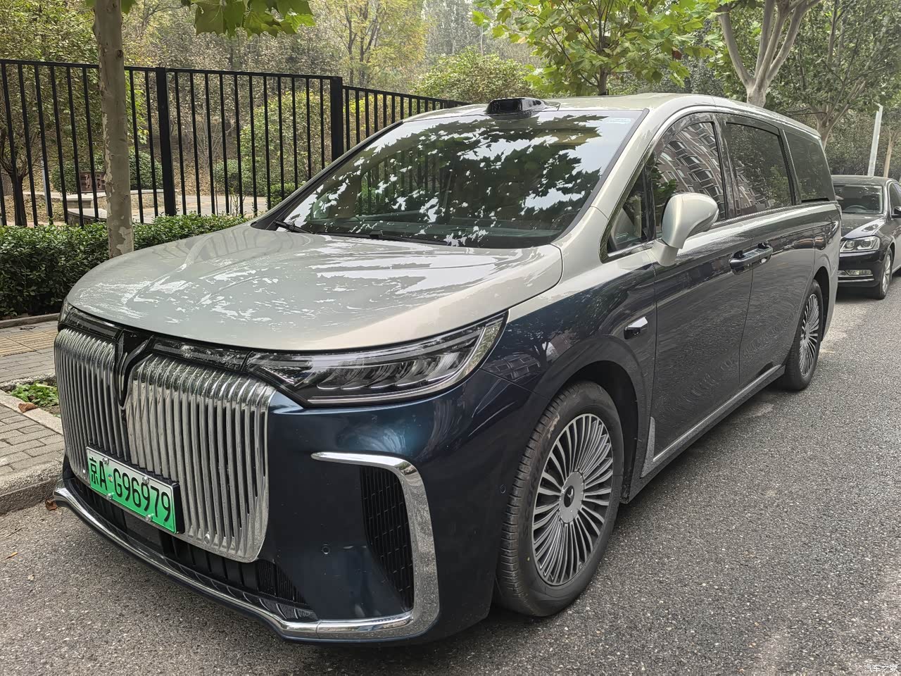该车的车身线条颇为利落,与MPV常有的那种臃肿感不同,其前脸的格栅造型颇为大气且不显浮夸,还搭配着20英寸的轮毂,看上去就如同百万级的豪车一般,在外无论是用来接待客户还是带着家人出行,都会显得特别有排面。我在提车当天便赶紧给车辆贴上了保护膜,如此好看的车漆可得细心呵护。