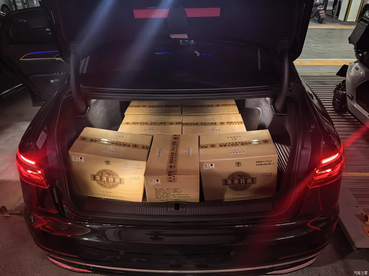 后备箱是真的大啊,能放下7箱酒,回一趟老家都给拉回去了。