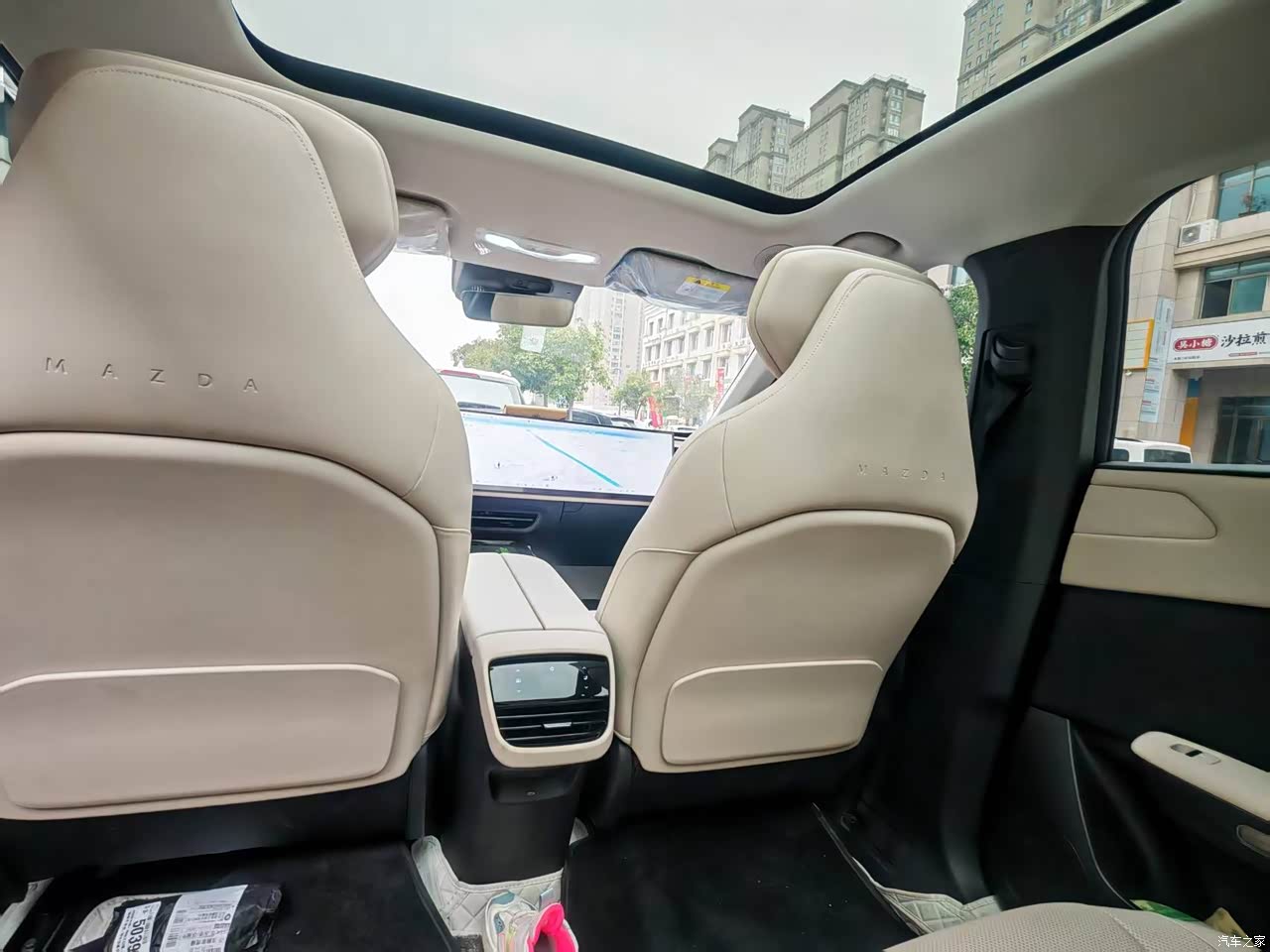 要说最满意的地方,那绝对是EZ-60的驾驶质感和“人马一体”的完美诠释。即便它是一辆电动车,马自达依然没有丢掉它的灵魂。当我握住方向盘的那一刻,我就知道这还是一辆马自达。转向手感精准而富有韧性,车头的指向性非常出色。电门踏板的响应既迅速又线性,没有某些电动车那种突兀的加速感,一切都恰到好处。底盘的调校也让人惊艳,既能过滤掉路面大部分的颠簸,又保留了足够的路感,高速过弯时车身姿态稳健,侧倾抑制得非常好。这份扎实的行驶高级感和与生俱来的驾驶乐趣,是许多纯电动车型难以匹敌的。空间表现符合预期。前排的驾乘空间非常宽敞,座椅包裹性和支撑性都很到位,长途驾驶也不会觉得疲劳。后排腿部空间足够充裕,即使是身高1米8的乘客也能找到舒适的坐姿。