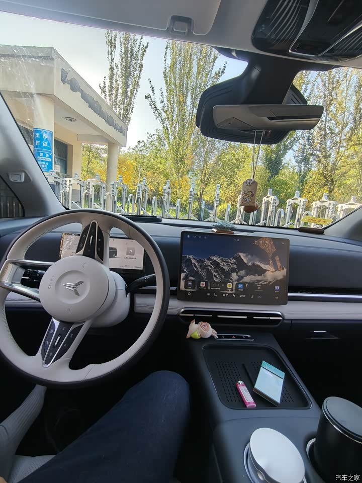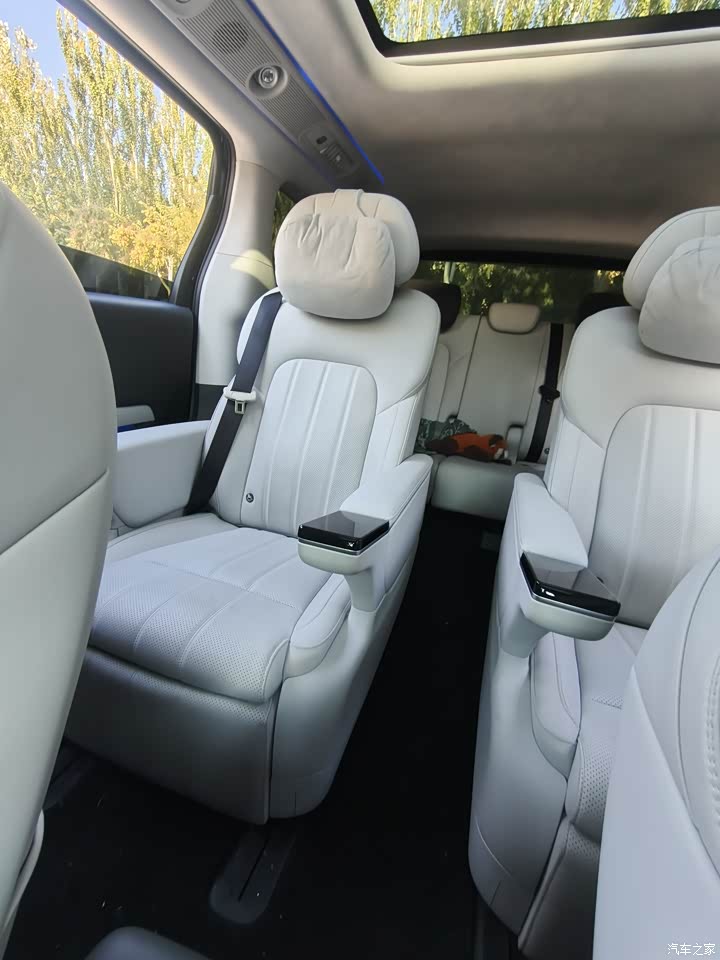 座舱内一整个高级感,摸起来很柔软,车内的材质用料很不错,很亲肤。刚提的新车没有异味,对有孩子家庭非常好。车内整体的风格是简约风,中控位置是一块15.6英寸的中控屏,主驾则是仪表屏加hud的组合。扶手箱位置配置了双开门的冷暖冰箱,还有杯架和无线充电。二排是两个航空座椅,还有两个小桌板,二排也是配备了手机的无线充电,头顶上方还有块大吸顶屏。