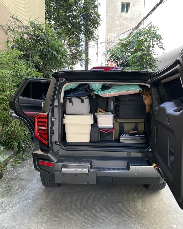 第一次在停车场见到实车,被种草,那种压迫感比看图片强多了。将近5米的车长,配上将近2米的车高,停在普通SUV旁边明显大一圈,视野特别好。设计耐看不过时:我买的黑色,刚开始觉得灰色可能更科技,后来发现黑色越看越顺眼。轮眉上那些外露的铆钉、方方正正的车尾,看久了反而觉得比那些圆润的城市SUV更耐看。“小书包”是灵魂:后挂备胎绝对是点睛之笔,让车尾看起来特别扎实。而且这种设计换胎方便,不用趴到车底下去掏。