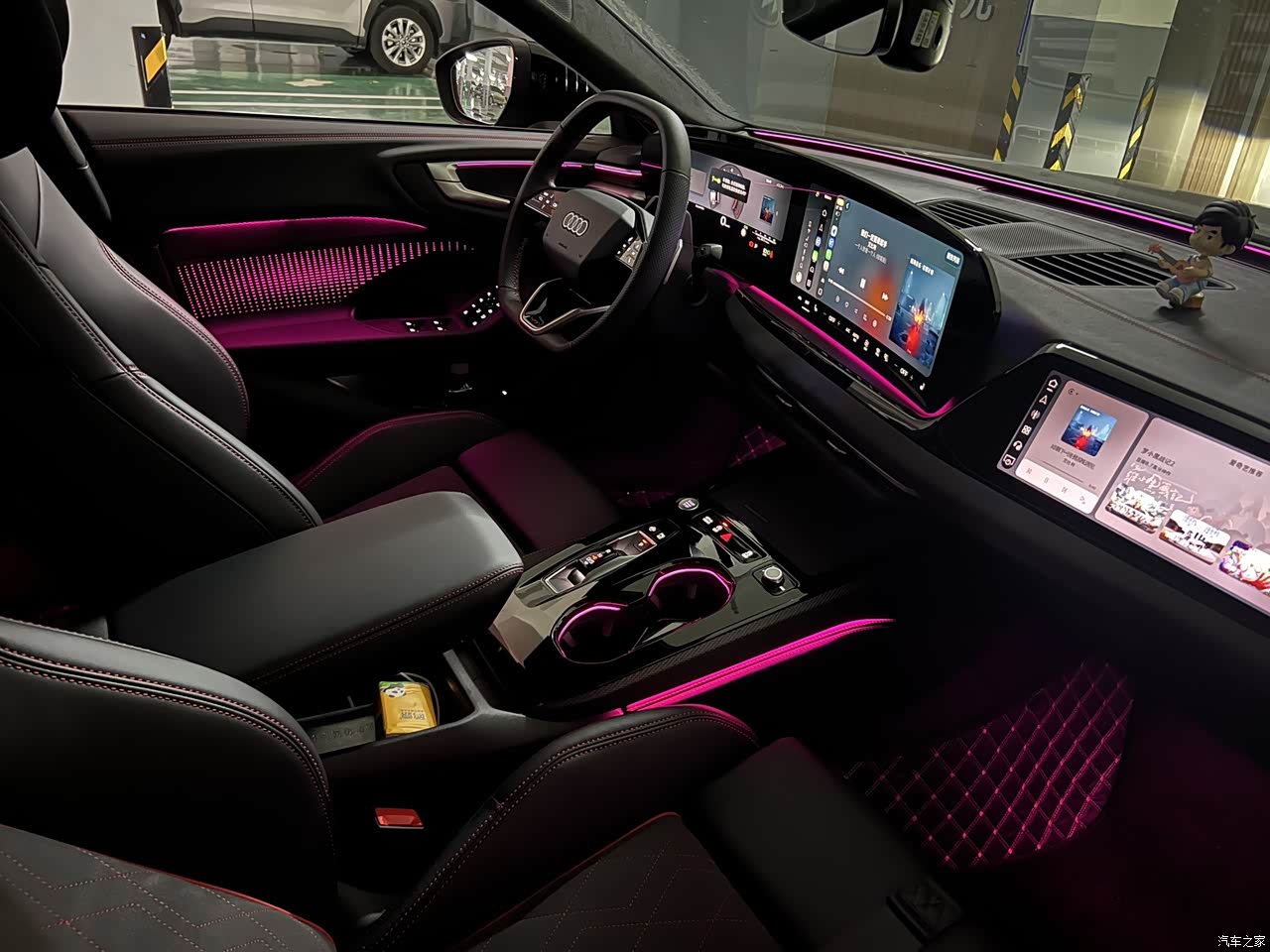 首发限量版的专属配件做的很好,20寸RS熏黑轮毂省去了我后期改装的麻烦,并且造型冷酷、犀利。高亮黑蜂窝状进气格栅搭配可发光的扁平化四环奥迪车标,视觉冲击力很强,科技感也很强,看着很凶。Sportback溜背线条飘逸、优雅,无框车门的设计更是Sportback的标志性设计之一,与电动掀背尾门的结合形成无敌的流线造型,配合熏黑首发限量竞速尾翼,运动感十足,帅炸了!