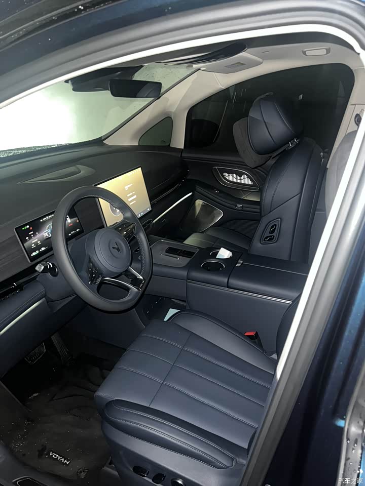 内饰 内饰我选玄青色,青里带墨,看着不沉也不飘,进到车里摸到的地方基本都是软包,手背贴上去不硬,中控台和门板上有斑马木纹,纹路顺,手指抹过去带点温润,车门的透光面板做了映山河图,夜里氛围灯亮起,图案像从里边浮出来,坐在第二排看着挺有意思,新车味道前两周能闻到,偏皮质和饰板的气味,我放了炭包,多开窗透气,两三周后气味淡下来了。
