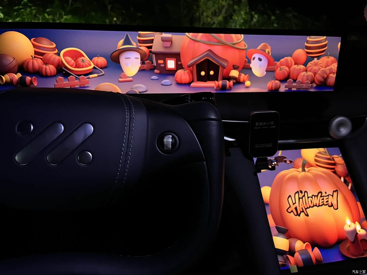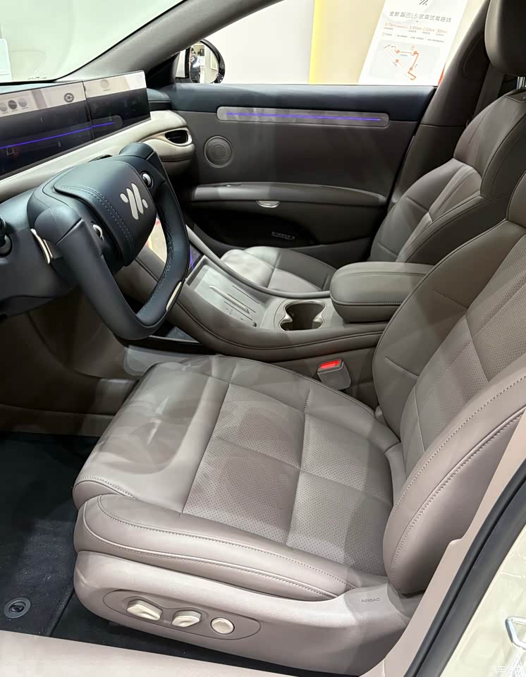 座椅都是真皮座椅,有白灰两种颜色,各有各的风格。半幅方向盘很多人不喜欢,但我感觉超级帅,而且也没有不习惯,很容易上手。大连屏很方便,雨夜模式超级友好,不用担心看不见反光镜了。副驾娱乐屏也能给副驾舒适的乘坐感。