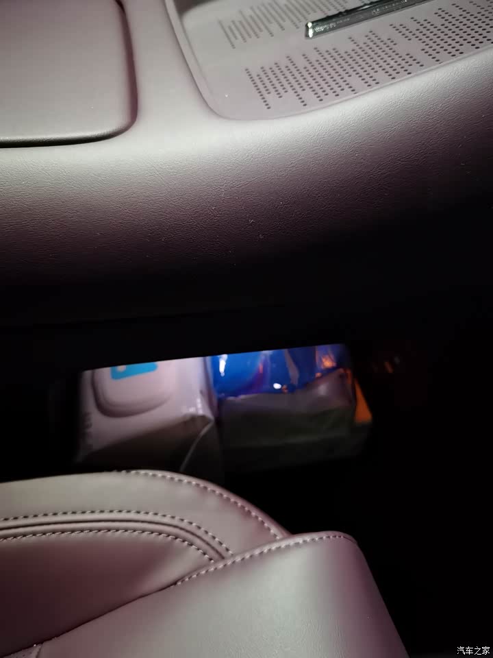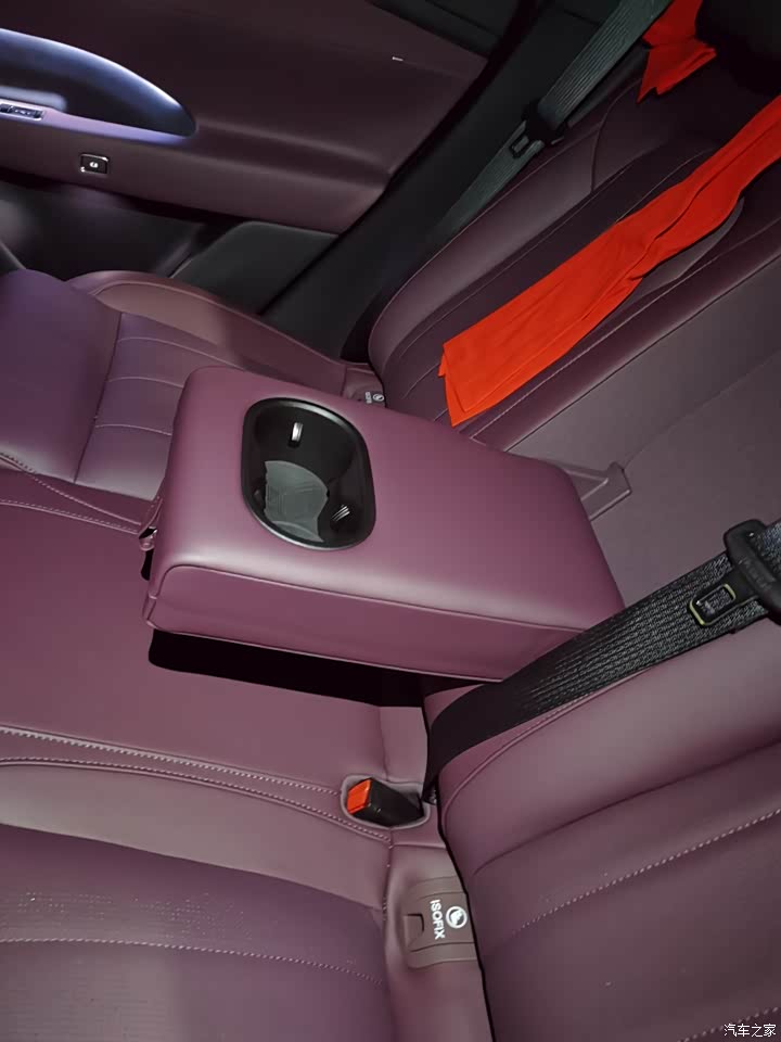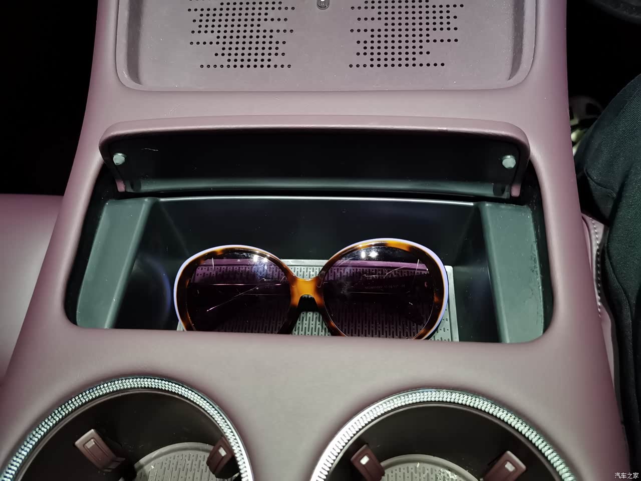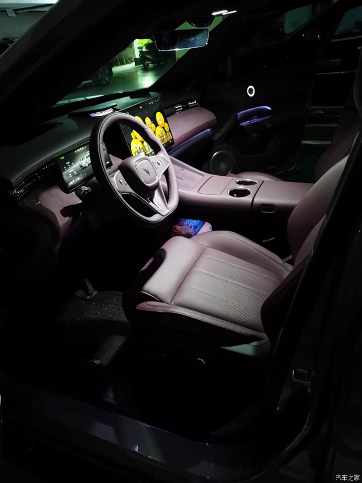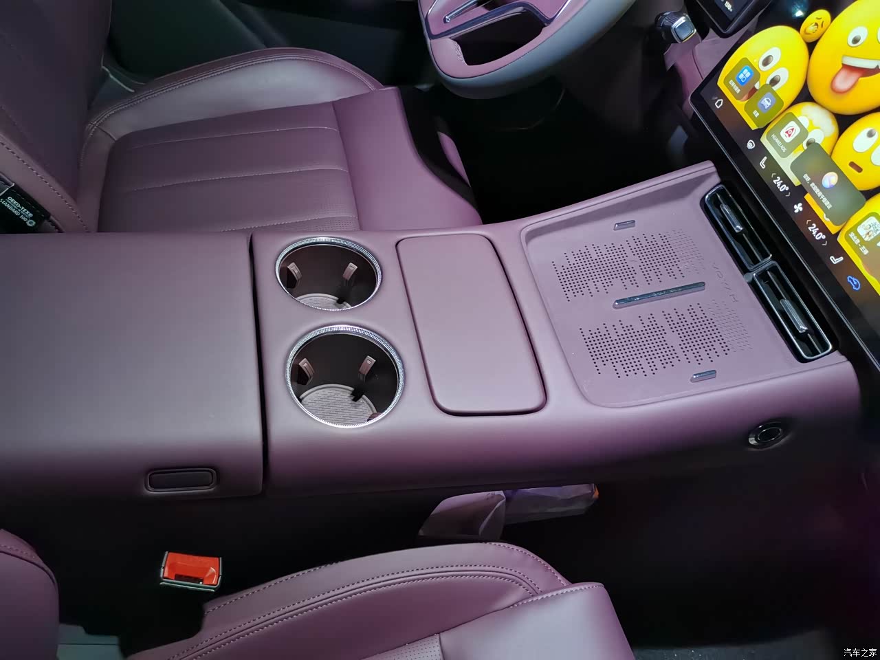 内饰我配的是和外观呼应的极光紫,坐进来这紫色调得稳,眼睛看着不累,朋友上车都说这配色选得对,座舱做的是浮光岛屿那套风格,大面积真皮包起来,伸手能碰到的地方都是软的,中控台和门板这些常摸的表面用的是仿麂皮,手背过去有绒感,沾了点灰拿软布擦一下就干净,副驾留给我老婆,她喜欢那个女王座椅带电动腿托,靠背能放到163度,她上车打开按摩,盖条毯子就补觉,手套箱基本被她的口红粉饼占满了。