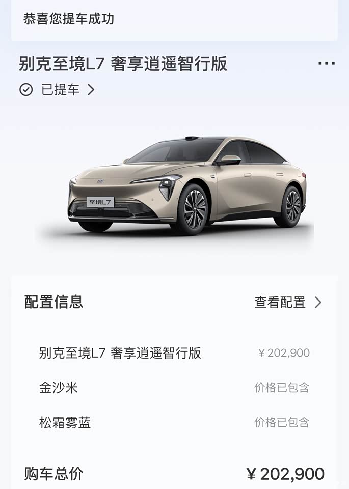 长大后第一辆小汽车,我选择了至境L7。 事情的起因就是想拥有一辆自己的小汽车,和朋友先后看了吉利、迈腾、帕萨特,感觉内饰和功能不太适合自己,缺少年轻感,后来在家人的建议下准备去看一下别克君越,到了店里,第一眼就喜欢上了这款至境L7展车,目光再也移不开了,但是当时还没有出价格,白色的内饰干净又利落,金沙米的外观,车身的线条,各方面简直长在了我的审美上,28日发布会,焦灼的等待价格公布,原本以为会20➕的车子,在公布价格那一刻,简直是热血沸腾,果断的下定了金沙米色的奢享逍遥智行版。 现在车已经提到,开了有一周了,感觉很不错,希望至境L7的车友们可以一起多交流呦,还没有买车的小伙伴们注意啦,26年开始有购置税了,但是想要购买至境L7不要怕,2025年11月30日前定车锁单,因别克原因25年没提车、需要在26年开票提车的,能拿至高一万元的厂家跨年购置税补贴哦~ 🚗