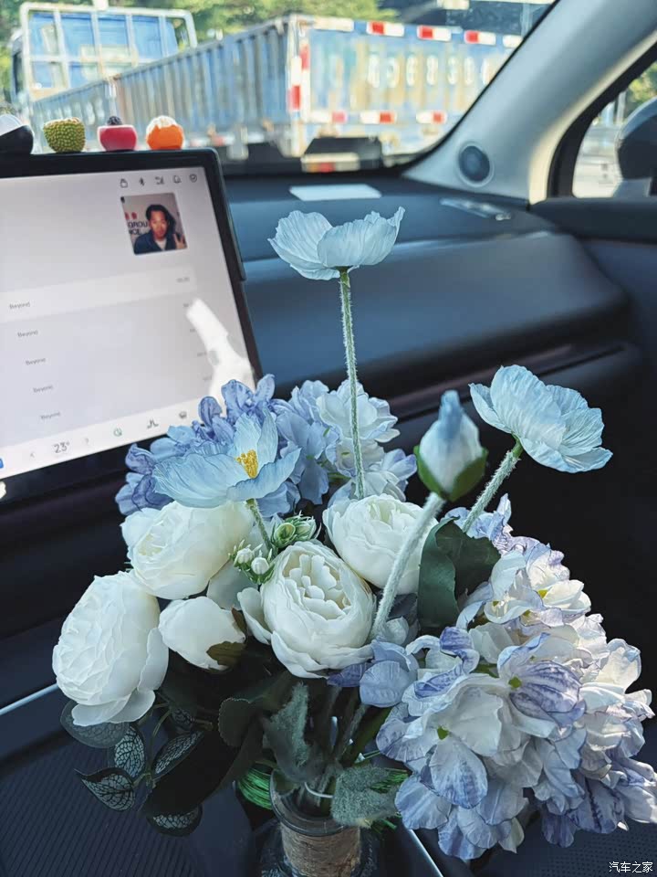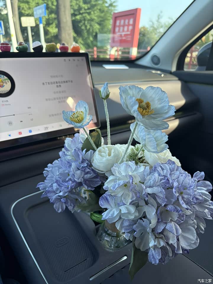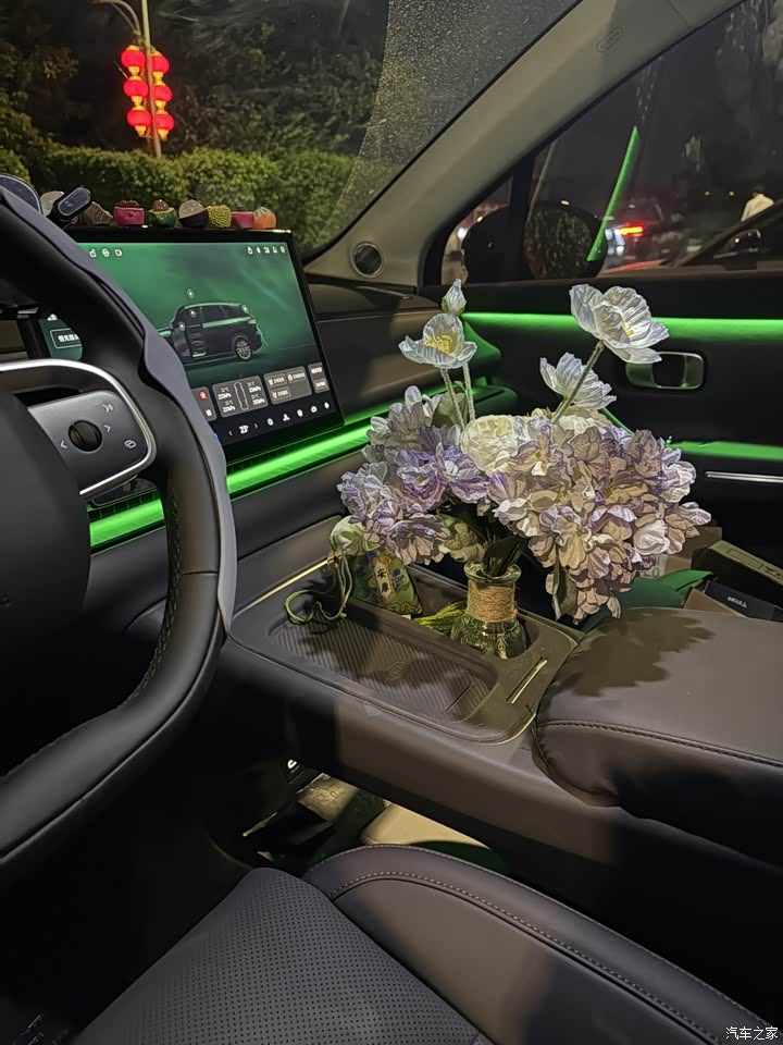 一坐进去挺简洁,没啥按钮。但摸上去手感一般。然后我自己搭配了花朵和贴纸,看起来更好看多了!我搭配的是紫色内饰,也是比较耐看一点的颜色。我加装了一个5000的服务包,搭配氛围灯听歌起来特别好看,光线也特别柔和。前面的屏幕也刚好,家里的宝宝从后排看电视这个距离不会伤眼睛👀