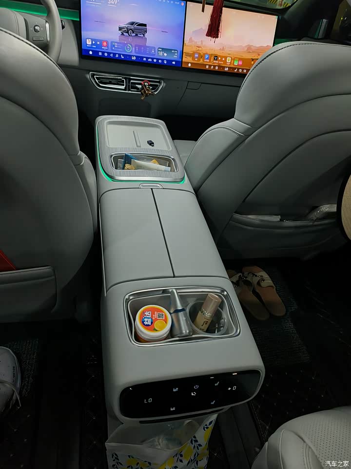 二排双零重力座椅加移动中岛(带冰箱),还有三个屏幕,标准的沙发彩电大冰箱(还是可移动),有人说这中岛是鸡肋,但用下来有些时候还挺实用,比如我图中把中岛后移,驾驶员腿部就获得了更大的空间,万一遇到主驾驶不敢开门,也方便从副驾下车。