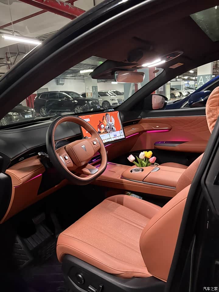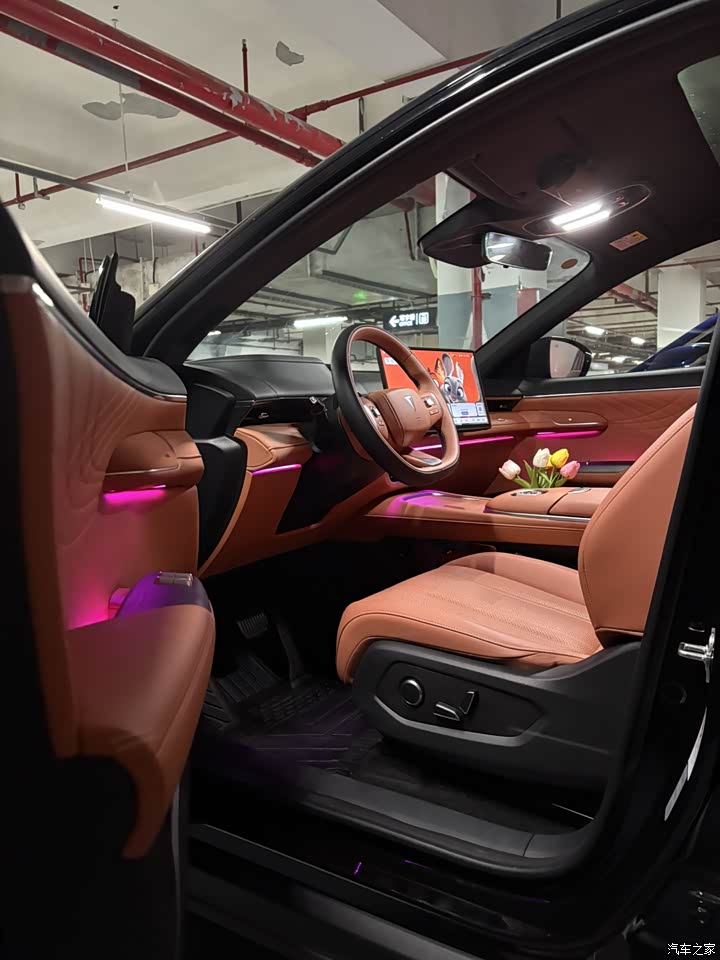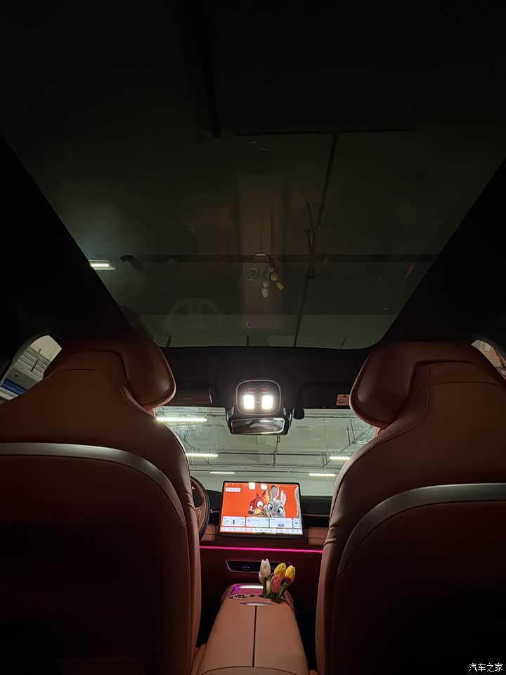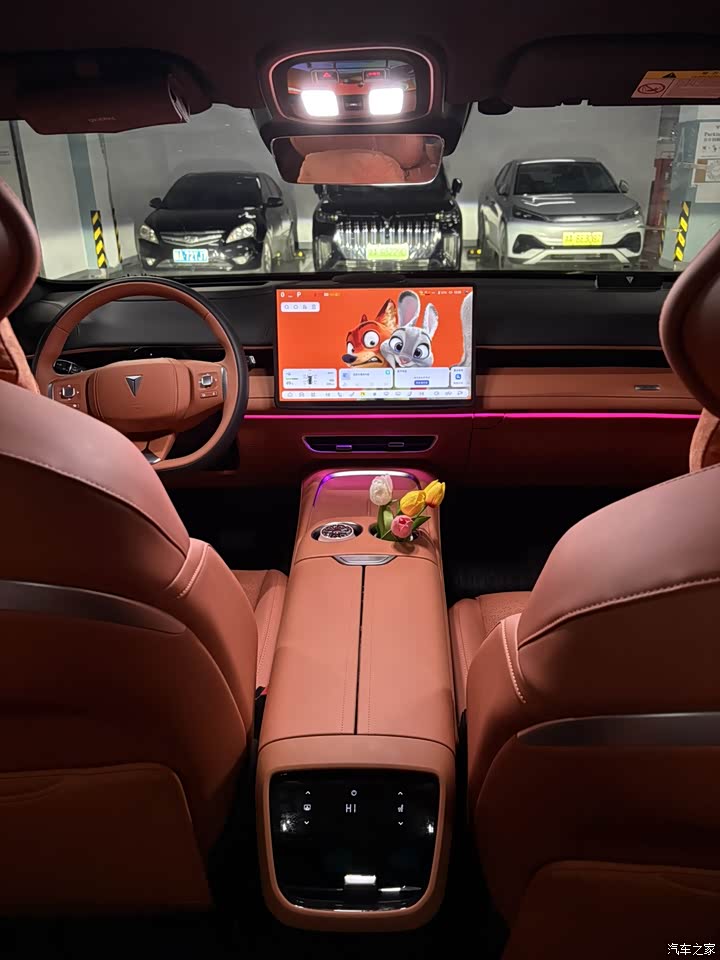 内饰优势:内饰科技感十足,可以旋转的向日葵屏幕很实用,有效的避免了主驾反光,很方便视野去浏览屏幕,大屏亮度也可以随着环境去调节明暗。手可以摸到的地方也都采用了大面积的软式包裹,科技和豪华感还是很不错的。水杯架配置了一束装饰花,视觉观感再上一层。