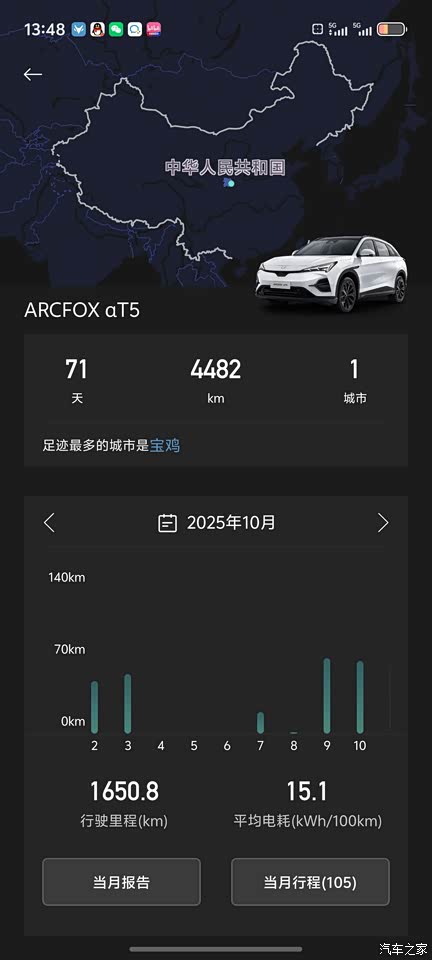 提车七十多天,极狐阿尔法 T5 已彻底融入了我的日常。对这辆座驾的整体表现,唯有“满意”二字。 最大的改变在于通勤。公司与家之间七十公里的路程,曾是阻隔。以前开油车,精打细算着每一笔油费,每周最多咬牙往返两次,每月油费开销稳稳站在800元以上。如今换了极狐,经济压力烟消云散,只要精力允许,我几乎每天都乐意跑个来回。上个月,我足足行驶了1650.8公里,而电费总支出仅为99.63元——这笔账,算得人心花怒放。 成本的骤降,悄然改变了我的生活半径与心态。如今归家不再是需要斟酌的“计划”,而是随心所欲的奔赴。更妙的是,因为出行成本几乎可以忽略不计,周末或是下班后,近郊的公园、新开的市集、朋友的小聚,想到便能成行。车子带给我的,已远不止是代步工具的价值,更是一种“说走就走”的自由和探索周边生活的乐趣。 当然,入冬后气温下降,我确实发现表显电耗有所升高,心里正有些嘀咕,结果偶然发现是胎压随着天气变冷降低了。于是我专门去店里补足了胎压,之后便照常每天上下班,没有为了省电而刻意改变驾驶习惯。 但今早的行车数据给了我一个惊喜:全程35.8公里,平均速度47km/h,最终平均电耗竟然达到了12.2 kWh/100km。这个在冷天里依然出色的成绩,让我瞬间安心。 如果说,选择极狐之初是看中了它的颜值与配置,那么这七十多天下来,“省钱”与“省心”成了它最坚实的口碑。 希望我的“小狐狸”能一直保持这样的稳健表现,继续做我出行路上最可靠的伙伴。