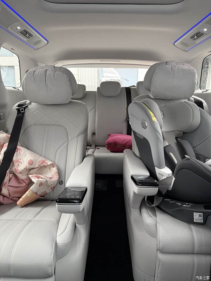 空间这块是买它的重要原因,第二排是两个独立座椅,加热通风按摩都齐,我身高1米78,主驾调好再坐第二排,腿能轻松翘起来,座椅包裹和支撑都到位,跑长途把按摩开上能缓解疲劳,第三排是亮点,很多七座车最后一排像小板凳只应急,这台第三排坐成年人没问题,我同样身高坐进去腿部留有余量不顶腿,头部没有压迫,第三排座椅也给了加热和通风,乘客位置没有区别对待,满员七座后备箱还有502升容积,两只大号行李箱加几个背包能塞下,装大件把第三排电动放倒,空间一下到2700升,装载性够用,车里小储物也顺手,门板能放水,中控台下方镂空空间能放包,拿取方便。