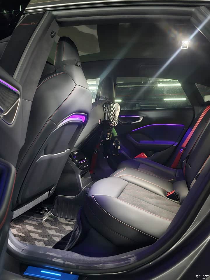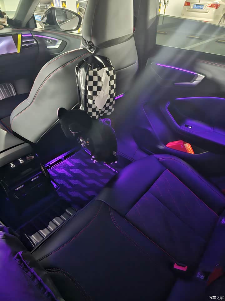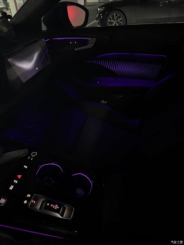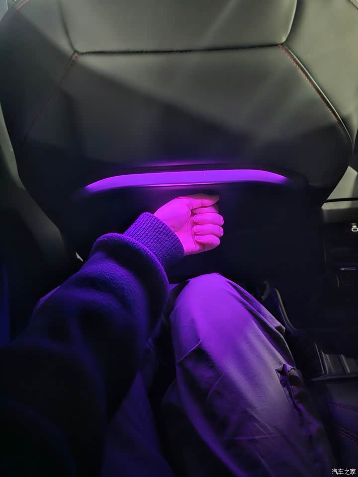 内饰设计风格像定制化桌面,科技感和运动感都在线,大联屏很吃年轻人的需求,氛围灯做的很漂亮,30色RGB,感觉灯光效果比很多电竞产品都要炫酷。电子换挡器精致小巧,每次换挡都有回馈感。座椅翻毛皮+红色缝线很运动,做工也比较细腻,有质感。